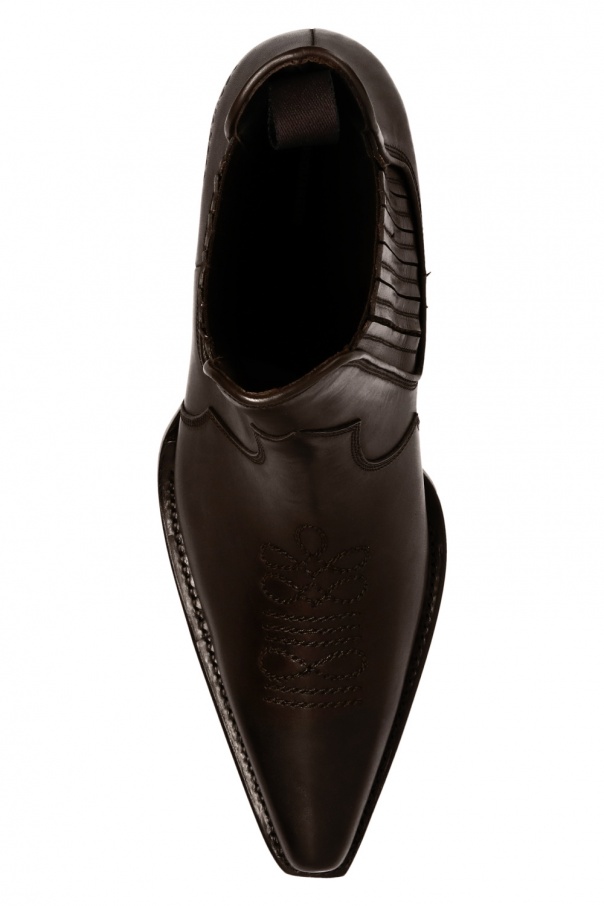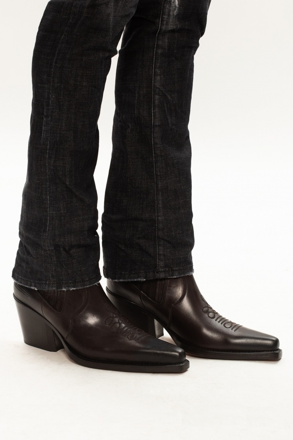 Brown heeled ankle boots from Dsquared2. Crafted from leather, this slip-on design features elastic side panels, embroidered pattern, embossed logo and a brown leather sole.