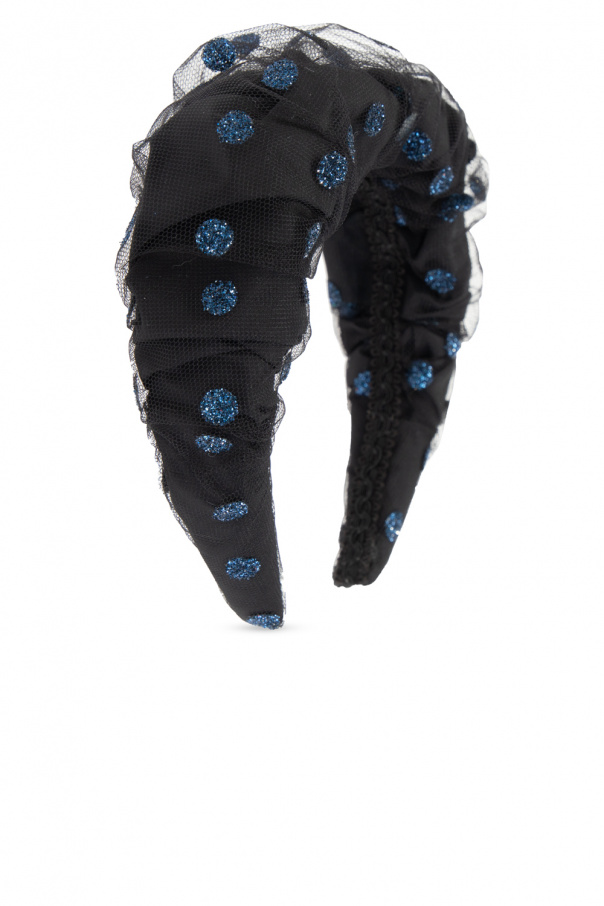 Black ruched headband from Red Valentino. This design is enriched by tulle and a polka dot pattern in navy embellished with glitter.