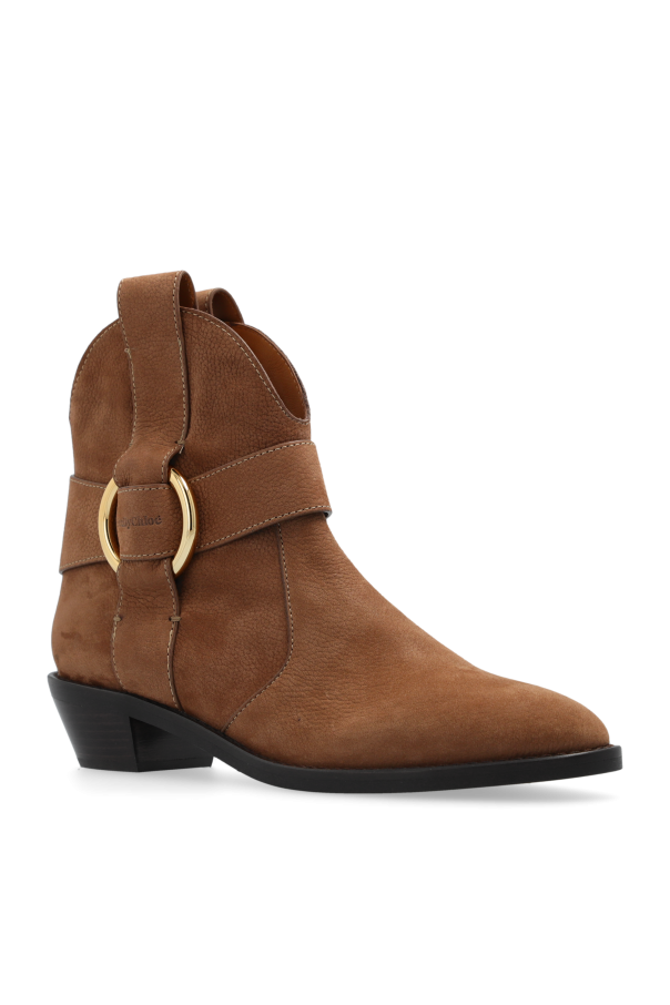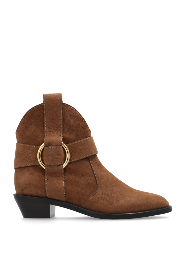 Introducing the quintessence of craftsmanship and style, the See By Chloé Leather Booties in a sophisticated brown hue are the epitome of luxurious western allure. Crafted from the finest suede leather, these booties boast a matte texture that exudes understated elegance. The distinctive shape, characterized by an elongated, pointed toe and an ankle-reaching shaft, is accentuated by a decorative golden metallic ring intertwined with a wide strap of the same sumptuous suede. This detail not only enhances the booties\' decorative appeal but also contributes to a more tailored fit. The medium-height heel, appearing in a contrasting black or wood-like material, provides a stable and comfortable elevation, perfect for any occasion. Attention to detail is evident in the seamless stitching running along the bootie’s silhouette and the ease of wear facilitated by a rear pull loop, suggesting a slip-on design without the need for visible closures. The interior, lined with leather matching the exterior\'s color, promises a seamless and high-quality finish, ensuring both comfort and durability. Why Purchase These Booties? Elegant western-inspired design with an elongated, pointed toe and high shaft Luxurious matte suede leather construction with a golden metallic ring for added sophistication Medium-height heel offering both stability and style High-quality leather interior and rubber sole for comfort and durability Exclusive design by See By Chloé, ensuring uniqueness and elegance