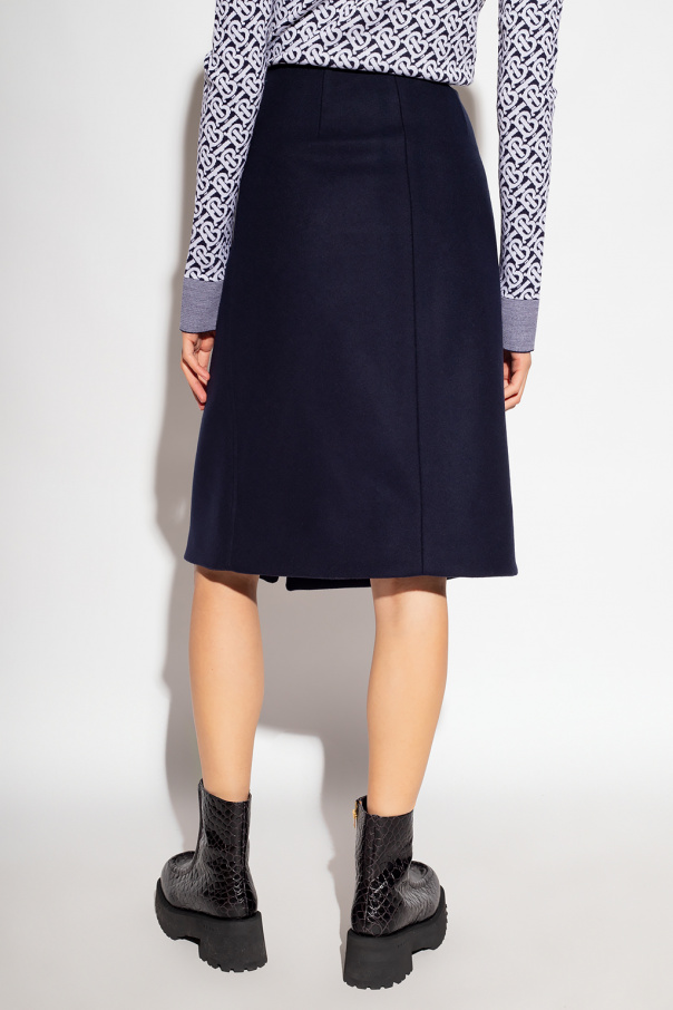 Navy blue ‘Peony’ skirt from Burberry. Crafted from a wool and cashmere blend, this style secures with buttons and silver-tone snaps with an engraved logo.