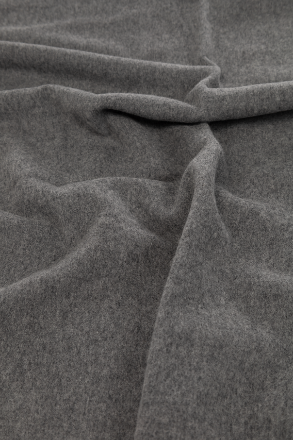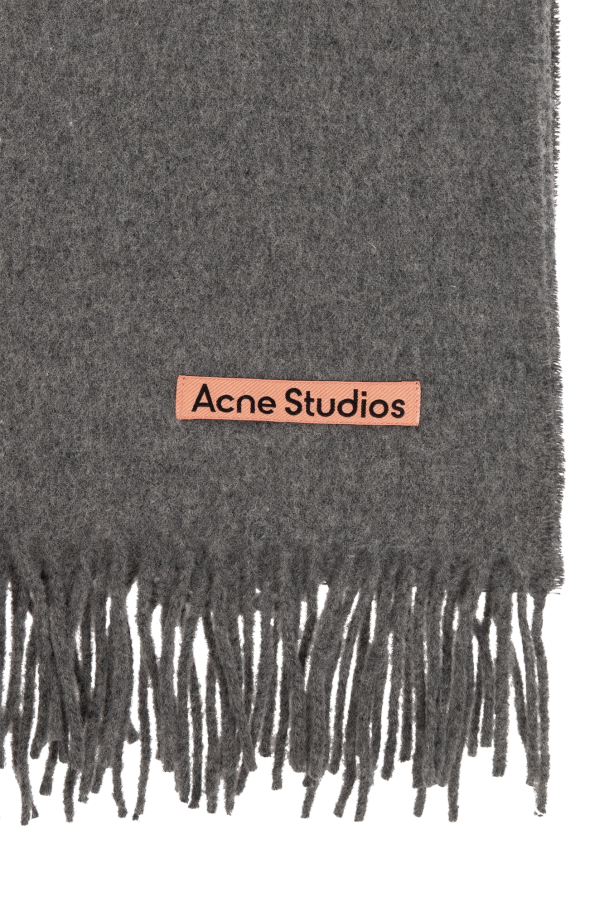 Dark grey scarf from Acne Studios. Made of wool, this item features a pink logo patch and fringe detailing.