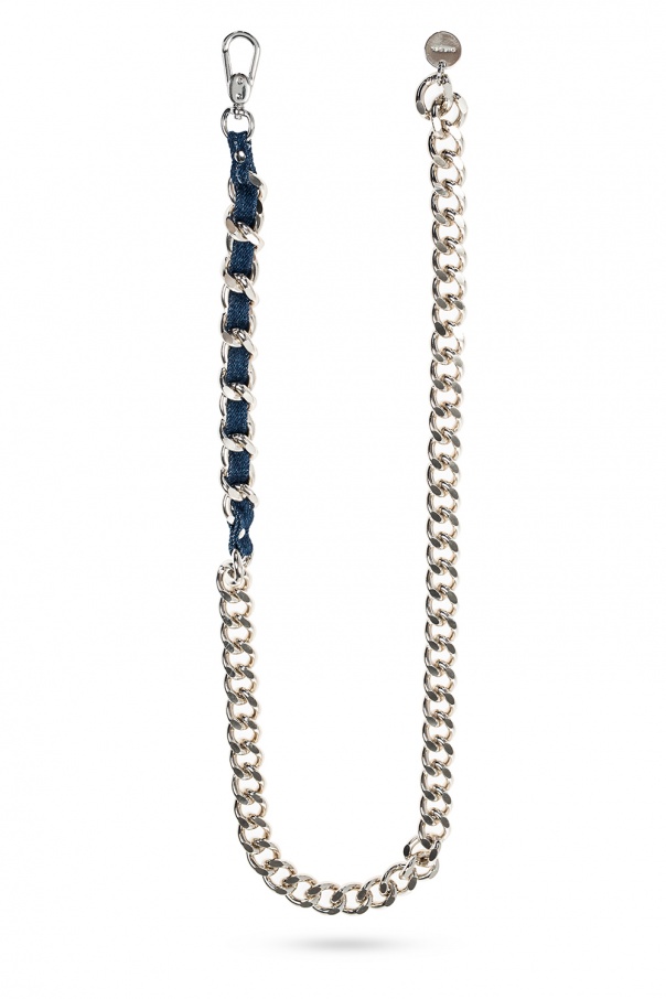 Belt with chain from Diesel. Crafted in metal, this accessory fastens via lobster clasp and employs navy blue denim detail and silver-tone metal fittings.