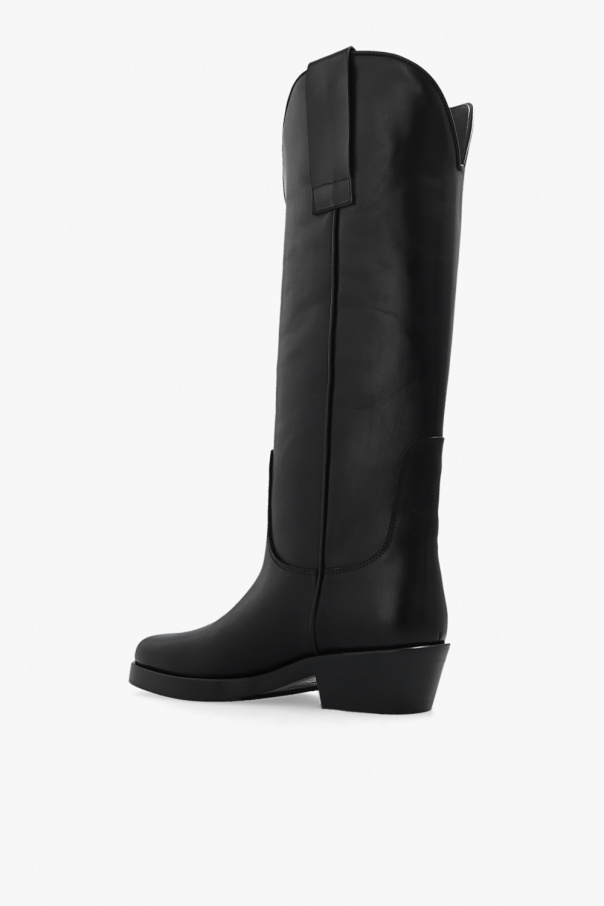 Black boots from Raf Simons. Crafted from leather with a slip-on silhouette, this model features a round toe and a cut-out upper with side pull tabs.