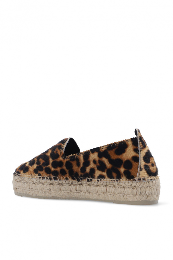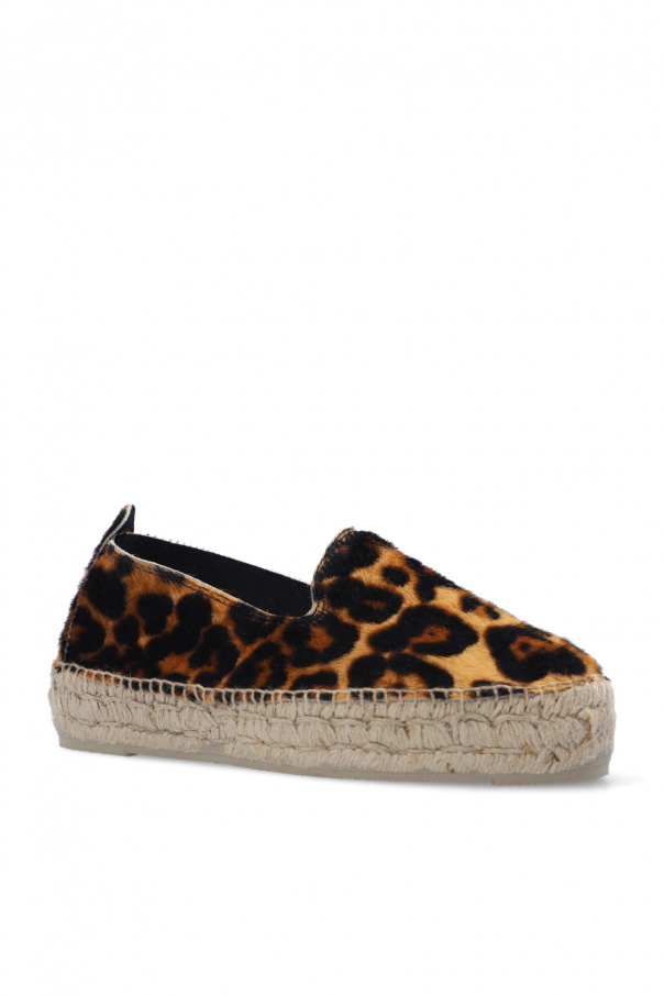 Brown and beige ‘Dakota’ espadrilles from Manebi. Crafted from calf hair, this model showcases an animal motif and a natural jute sole with a thin rubber layer in grey.
