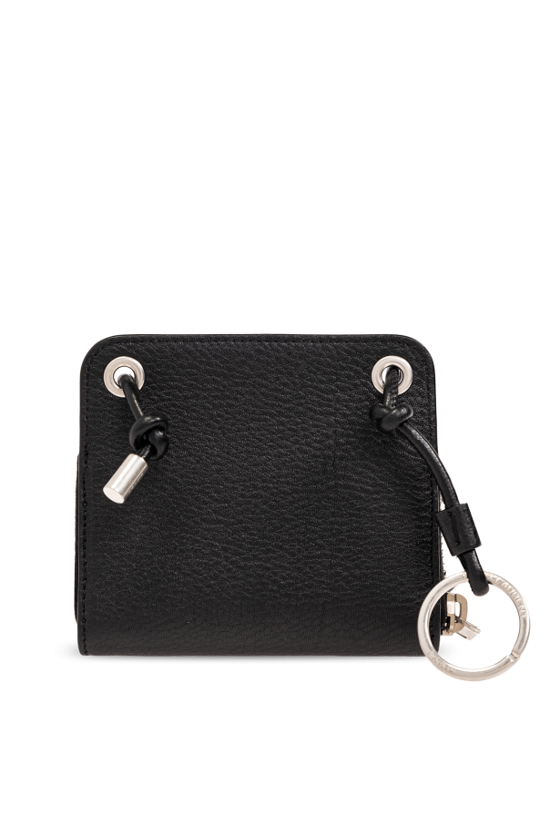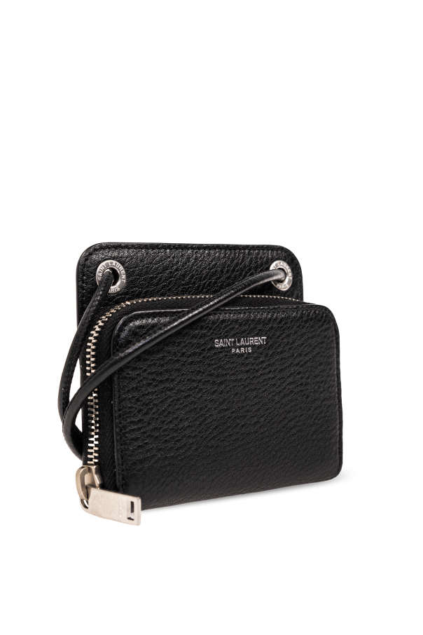 Black wallet from Saint Laurent. Made of calf leather, this item fastens via a zip and showcases an embossed logo, silver-tone metal hardware as well as an adjustable neck strap and three internal compartments. Comes with a keyring.