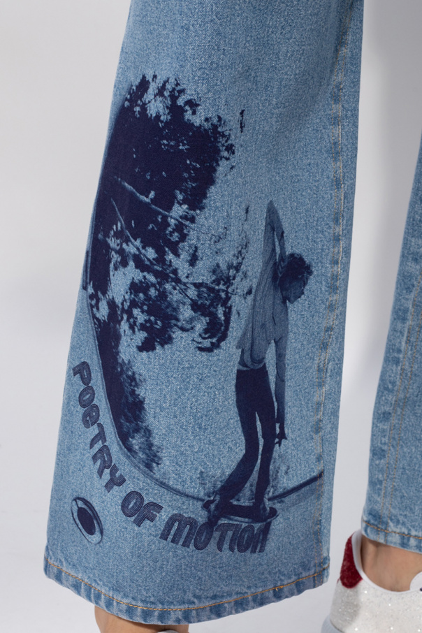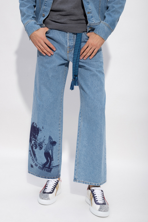 Blue jeans from Lanvin. Falling with straight legs, this pair features button fastenings, classic five pockets, a navy blue graphic print and an included navy blue and blue patterned belt accentuated with silver-tone hardware with an embossed logo.