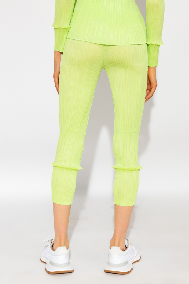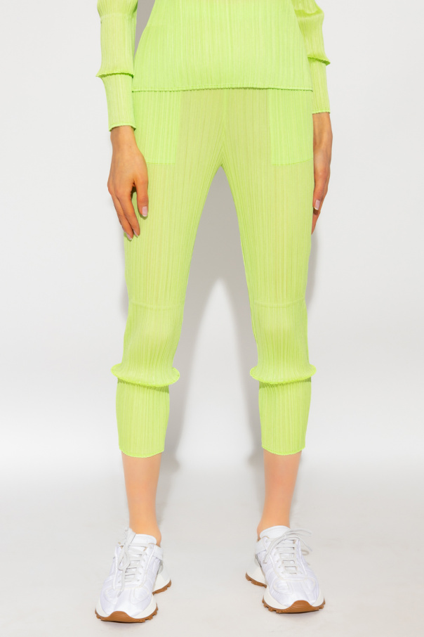 Neon green trousers from Issey Miyake Pleats Please. Distinguished by the brand's signature pleating technique, this pair features an elasticated waistband, side pockets and cropped legs.