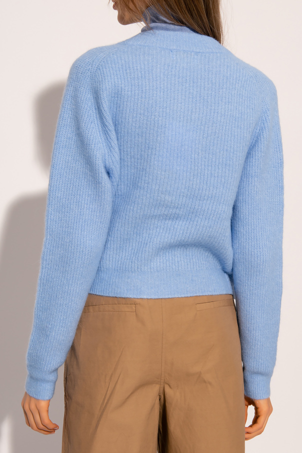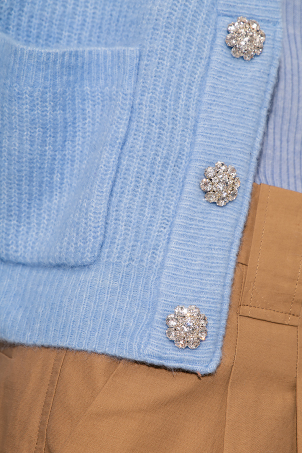 Light blue V-neck cardigan from Ganni. Fastened with jewelled buttons, this design features two slip pockets and ribbed trims at the hem and cuffs.