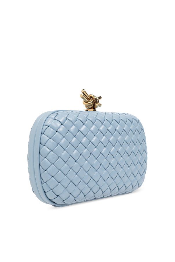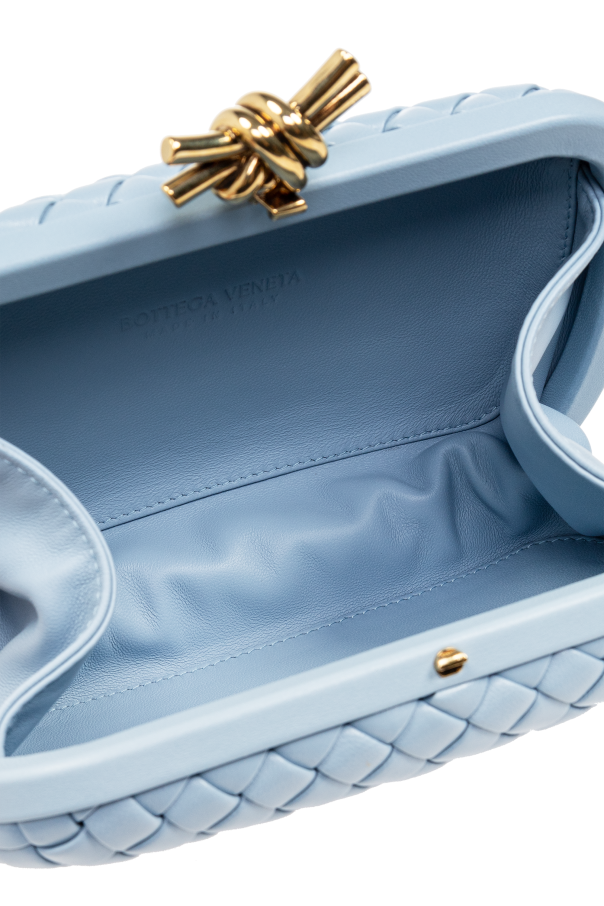 Introducing the exquisite \'Knot Small\' clutch by Bottega Veneta, a marvel of design that seamlessly blends sophisticated aesthetics with unparalleled craftsmanship. This piece is adorned in a captivating blue hue, with the brand\'s signature \'Intreccio\' weave lending it a texture that is both visually striking and delightfully tactile. Crafted from the finest lamb leather, both inside and out, the clutch exudes luxury from every angle. The clutch\'s rectangular silhouette, with its gently rounded corners, presents a modern elegance, while the matte surface with a subtle sheen suggests a meticulous attention to detail and quality. A distinctive feature, the golden brass knot-shaped clasp, not only secures your belongings but also serves as a sophisticated emblem of the Bottega Veneta legacy. The interior, mirroring the exterior\'s blue, includes a main compartment, detailed with precision, possibly housing additional pockets for organization. The presence of the brand name within the interior further solidifies this clutch as a testament to luxury and designer precision. Why Purchase This Product? Exclusive design by Bottega Veneta, renowned for elegance and quality. Unique \'Intreccio\' weave and lamb leather construction, reflecting sophistication. Iconic golden brass knot clasp, offering both security and a touch of luxury. Perfect blend of form and function, ideal for elevating any ensemble.