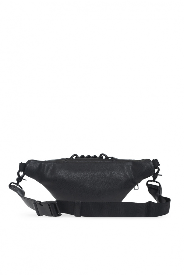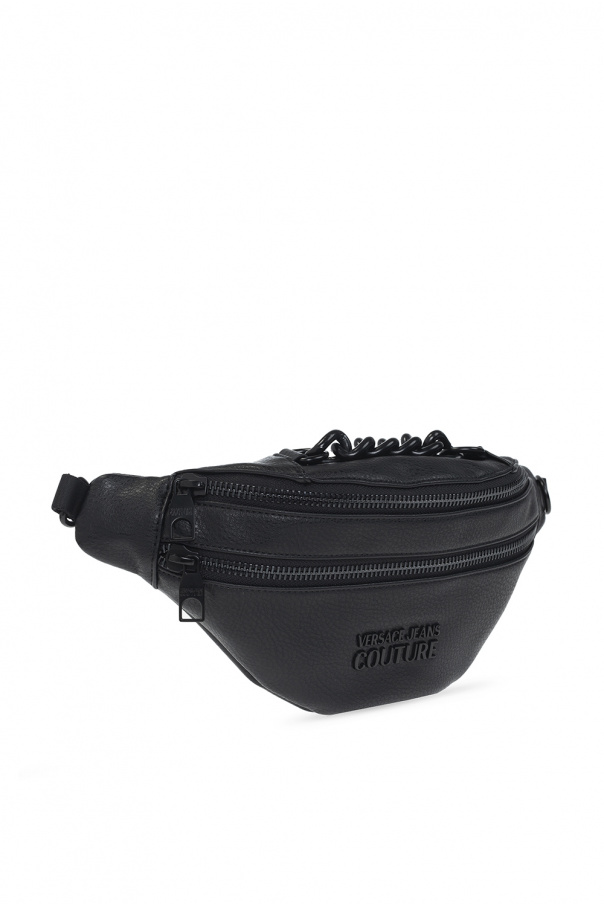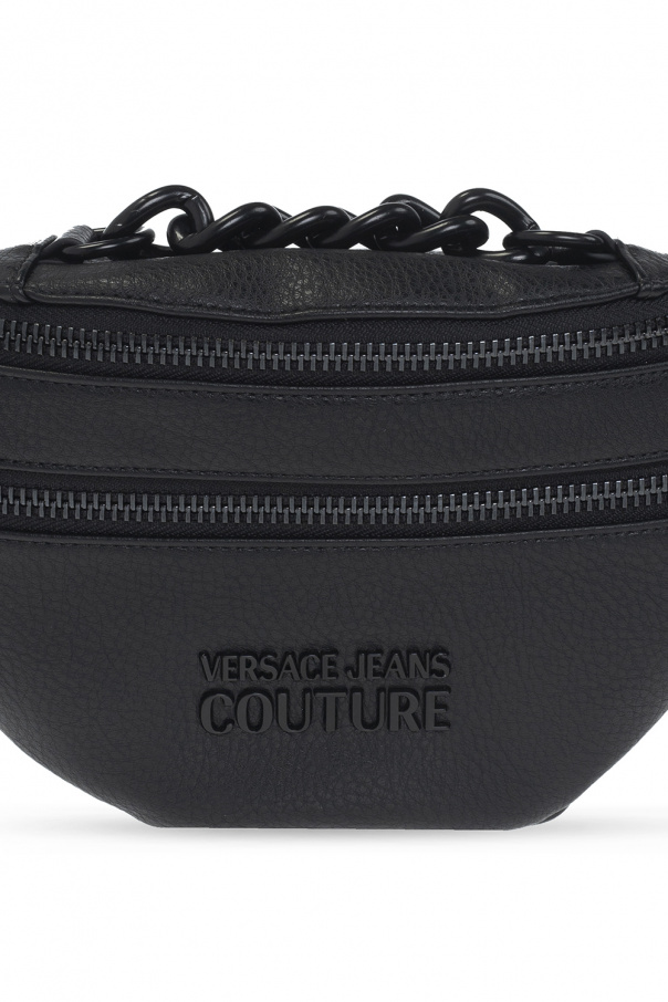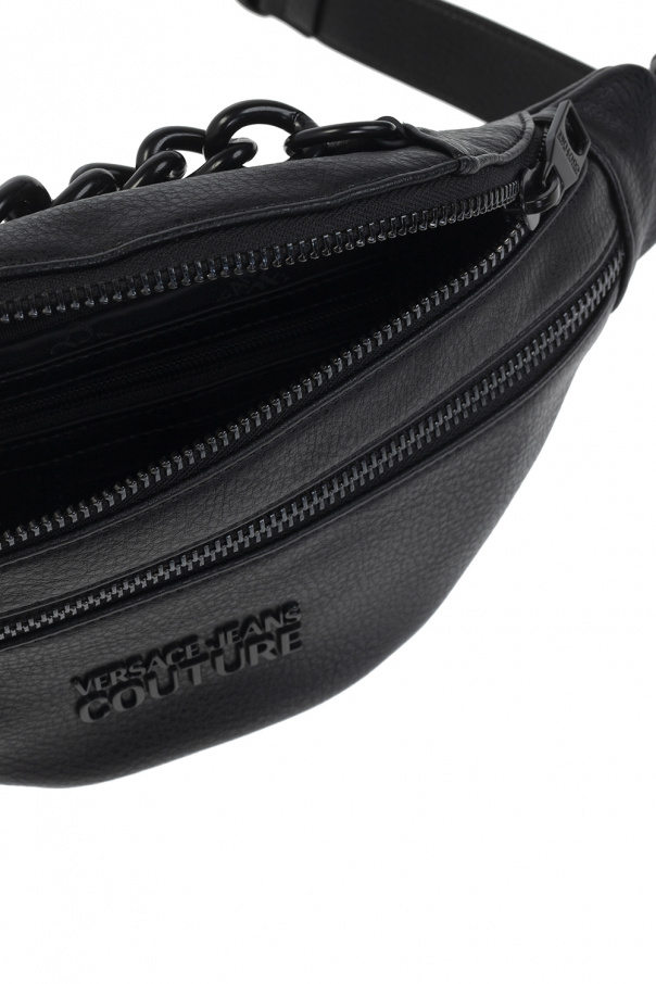 Black belt bag from Versace Jeans Couture. Crafted from faux-leather, this design features two separate zipped compartments, a metal logo plaque on the front, a half-round chain handle, an adjustable strap and one internal compartment with a zipped pocket.