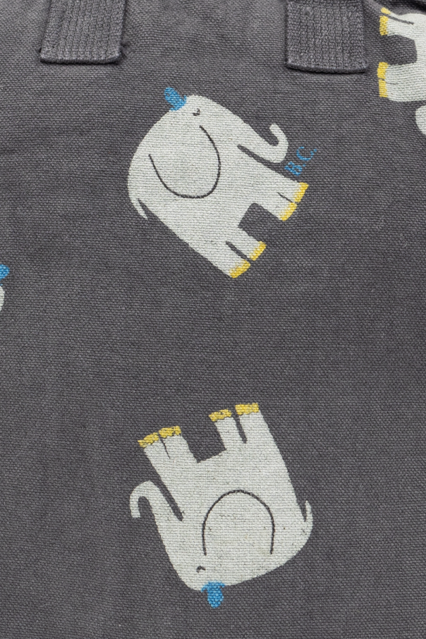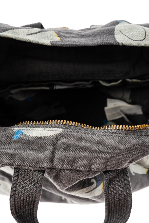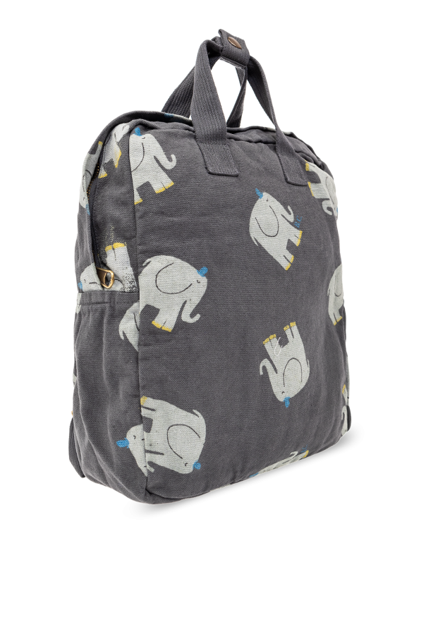 Dark grey backpack from Bobo Choses. Made from cotton, this design fastens with a zip and showcases a grey elephant motif. It is complete with top handles with snap closures, adjustable shoulder straps, gold-tone metal hardware and one internal compartment with a slip pocket.