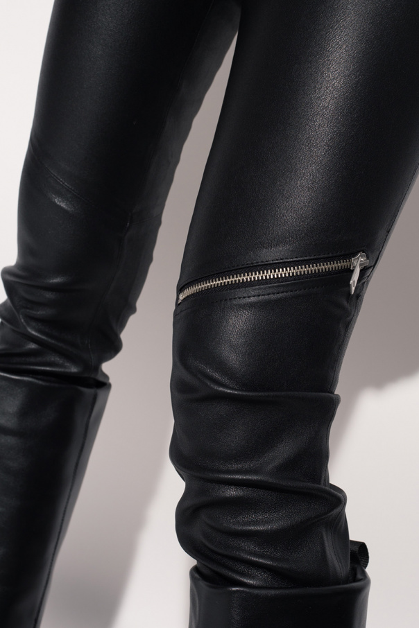 Black ‘Kriva’ leather trousers from AllSaints. Crafted from sheep leather, this pair has an elastic waistband and tapered legs with stitching details and zips.