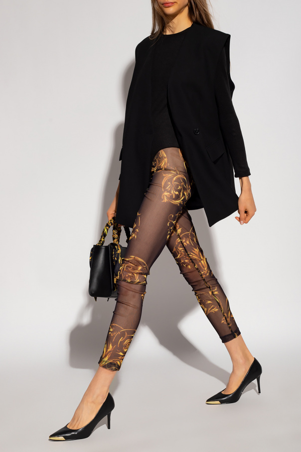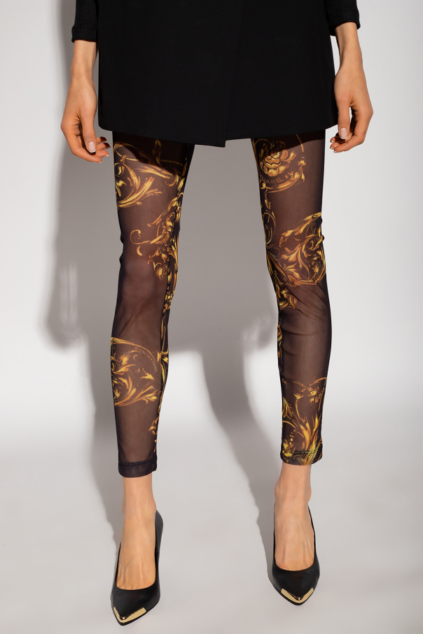 Black leggings from Versace Jeans Couture. Crafted with a semi-sheer finish, they showcase the brand\'s iconic yellow-orange-brown Barocco print and a black and white waistband with a logo.