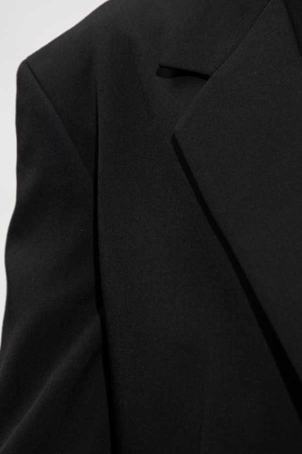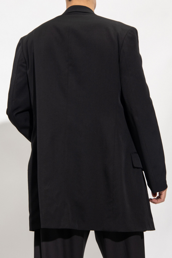 Black blazer from Yohji Yamamoto. crafted from wool with a single-breasted silhouette, this style features a collar with notch lapels, button fastenings, one slip pocket, two flapped pockets and a double back vent accentuated with a zipper.
