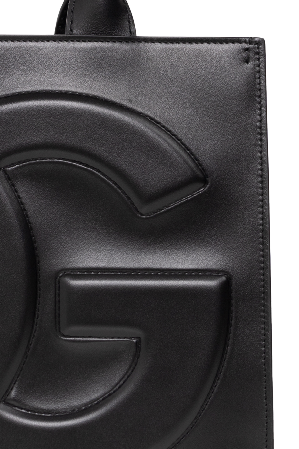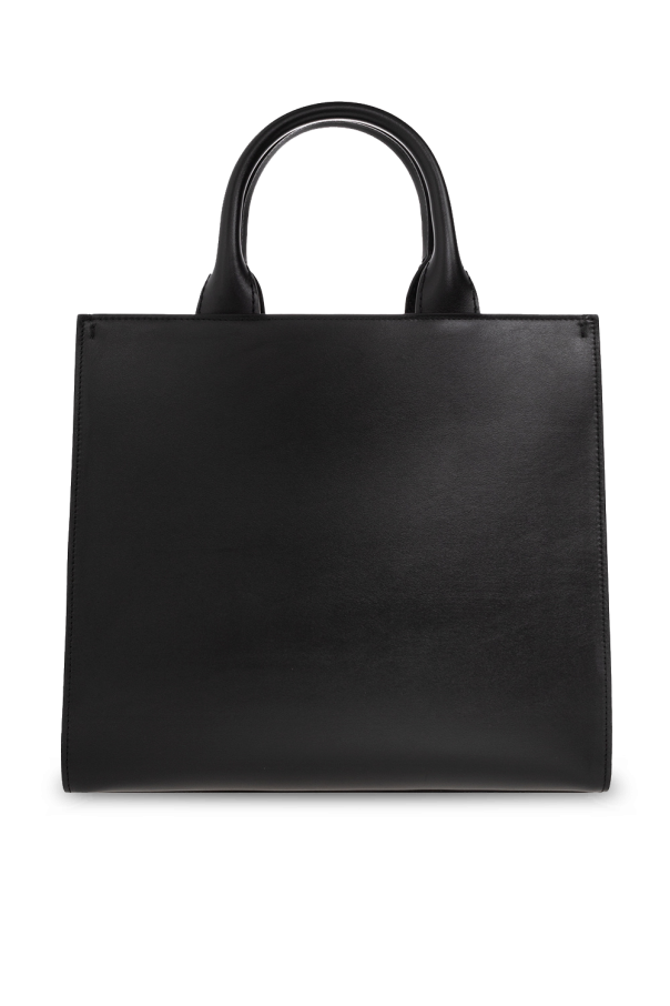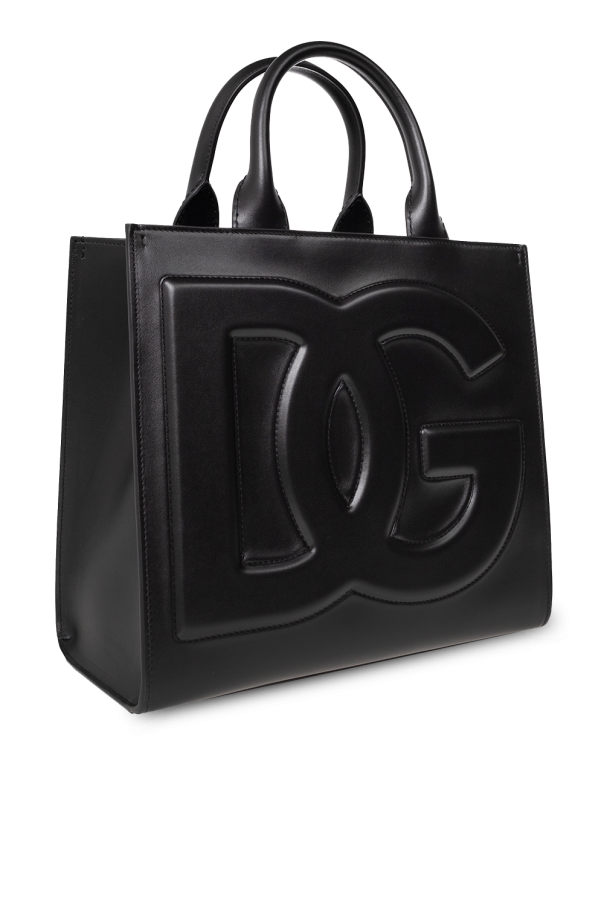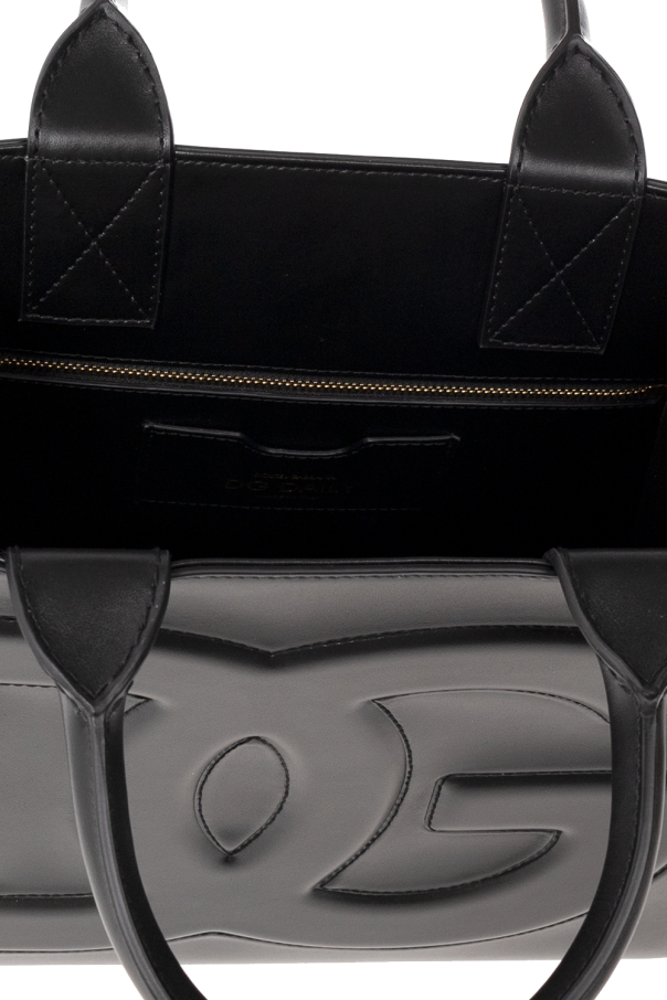 Black \'DG Daily\' shopper from Dolce & Gabbana. Made of leather, this design showcases an embossed and embroidered logo, two half-round handles, gold-tone metal hardware and one internal compartment with one slip pocket and one zip pocket.