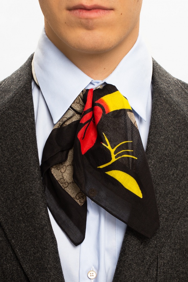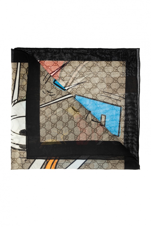 Black and grey shawl from Disney x Gucci. Woven from wool and synthetic yarns with logo pattern, this accessory boasts a colourful graphic print.