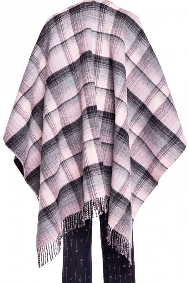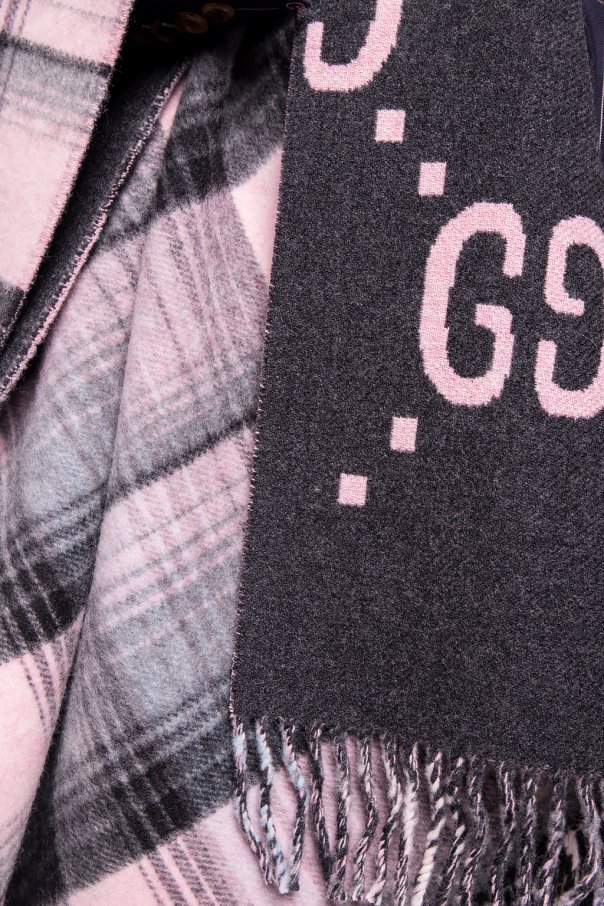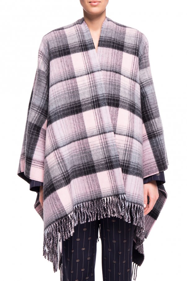 Grey and pink poncho from Gucci. Made of wool. Embellished with woven check pattern and GG motif. Finished with fringes.