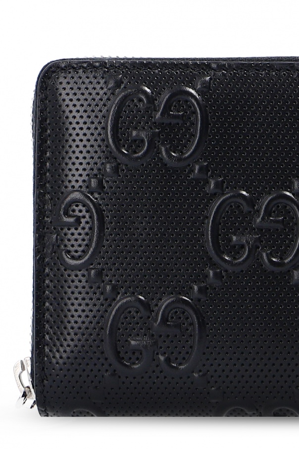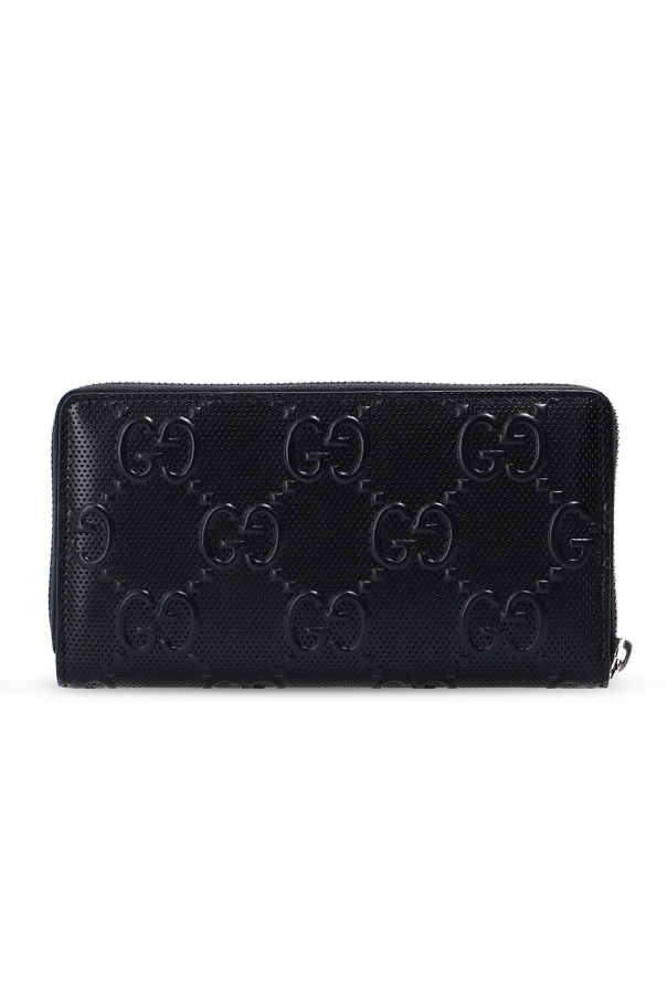 Black wallet from Gucci. Crafted from leather, this item features zip-around fastening, embossed logo, silver-tone metal hardware, three bill compartments, coin pocket with zip fastening and twelve card slots.