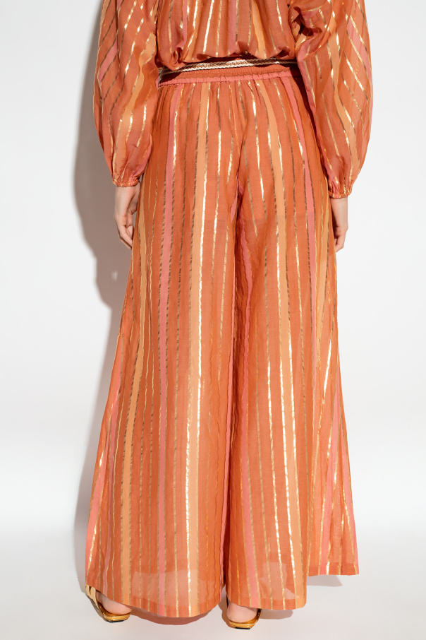 Orange, pink and brown loose-fitting trousers from Zimmermann. Made of cotton, this pair features an elastic waistband, woven belt with fringes, stripe pattern inlaid with gold-tone lurex threads, two slip pockets and wide legs with decorative pleats on the front.