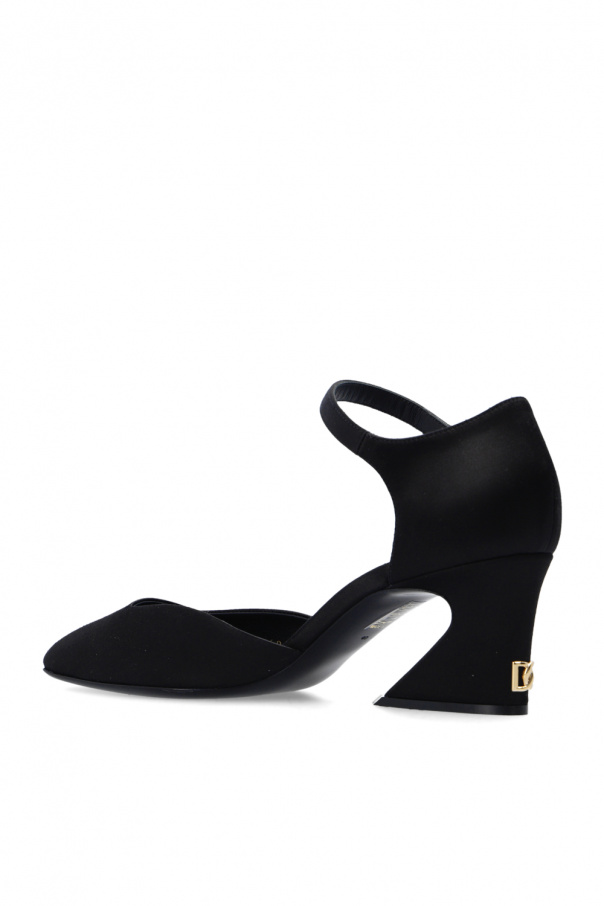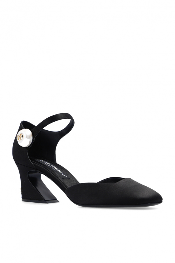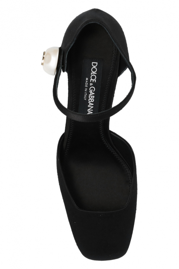 Black ‘Jackie’ pumps from Dolce & Gabbana, the ‘Hot Stuff’ collection. Crafted from shimmering satin, this model features a shirred ankle strap adorned with a faux-pearl and a gold-tone logo plaque, a square toe, a geometrical heel and a black leather sole.