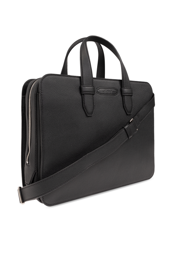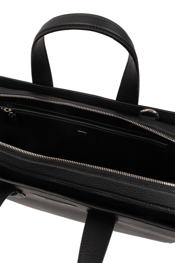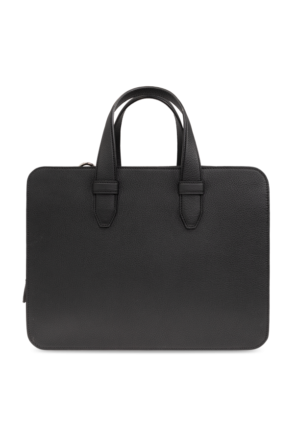 Introducing the quintessence of professionalism and minimalist design - the Brioni Handheld Document Bag. Crafted from premium grain-textured leather, this exquisite piece is not merely an accessory but a statement of elegance and functionality. Its sleek, rectangular silhouette is perfectly sized to accommodate documents or a laptop, making it an indispensable companion for the discerning professional. The bag features robust, rounded handles for hand carrying and an adjustable, detachable strap offering versatility to wear it over the shoulder or cross-body. The refined, embossed logo of the designer on the front adds a subtle touch of luxury without overpowering the design\'s sophisticated simplicity. Enhanced functionality is evident in the addition of a rear flat pocket with a zip closure, allowing for easy access to essential items. Quality craftsmanship is showcased through precision stitching and metallic details in silver or satin nickel, harmonizing with the bag’s overall aesthetic. The main compartment secures with a dual-pole zipper, ensuring the safety of your belongings, while the interior is thoughtfully organized with a zippered pocket and two slip pockets. Why Purchase This Product? Constructed from 100% genuine leather with a grainy texture for durability and style. Designed by the esteemed Brioni, known for their commitment to quality and elegance. Practical design featuring multiple pockets, including a magnetic closure pocket on the front and back for easy access. Versatile carrying options with sturdy half-circle handles and an adjustable, detachable strap. Secured storage with a dual-pole zip main compartment and additional inner pockets for organization.