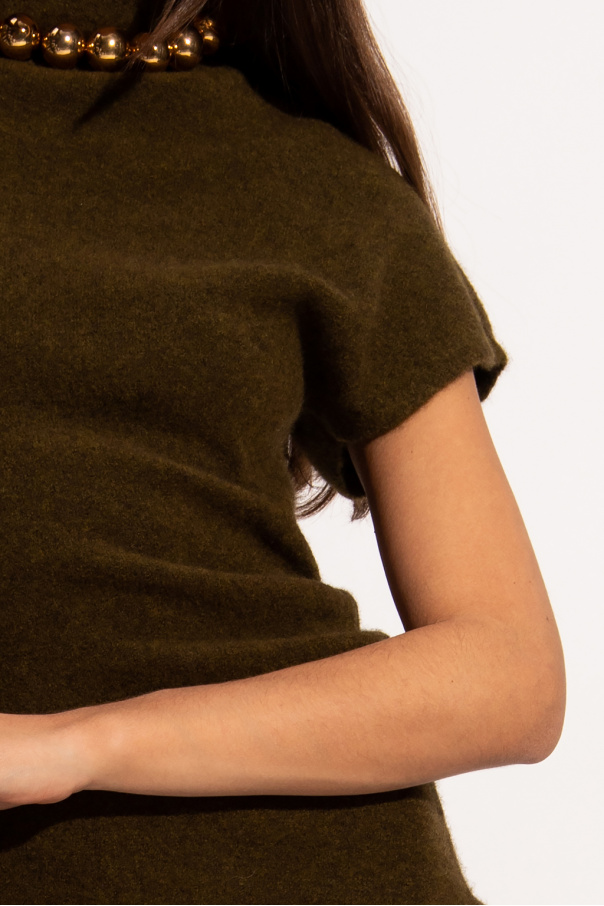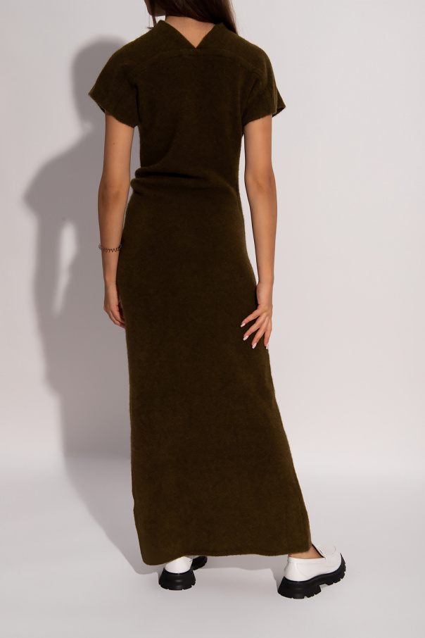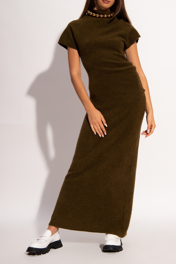 Dark green ruched dress from Proenza Schouler. Crafted from a merino and yak wool blend, this short sleeve design is enriched by cut-outs at the back.