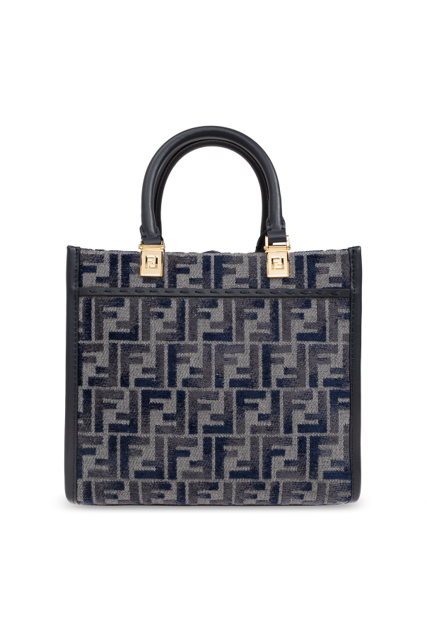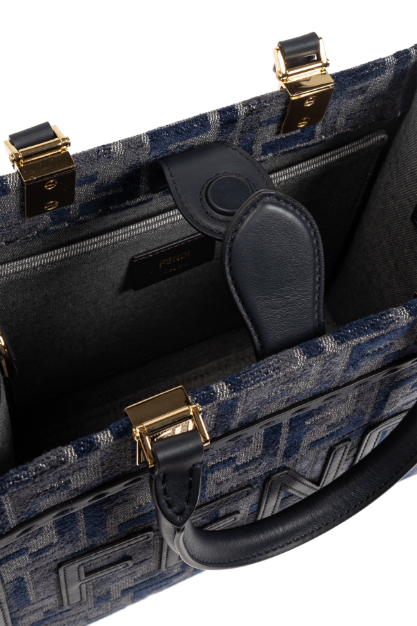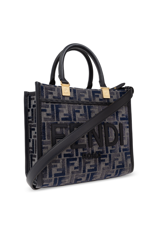 Introducing the Sunshine Small Shopper Bag from the exclusive Fendi collection, a quintessential blend of elegance and practicality. This classic rectangular shopper, adorned in a deep navy hue, boasts the iconic \"F\" pattern synonymous with Fendi\'s timeless design. Crafted from premium materials, the exterior features a refined textile pattern complemented by luxurious calfskin leather handles and an adjustable shoulder strap. The bag is accentuated with a prominent \"FENDI ROMA\" insignia on the front, and the handles are elegantly secured with gold-toned metal hardware. The interior is spacious and thoughtfully designed, featuring a main compartment with a slip pocket and a magnetic closure for added convenience. The meticulous attention to detail ensures both style and functionality for everyday city use. Why Choose This Product? Exquisite design by the renowned Fendi fashion house. Timeless navy blue with signature FF monogram. Durable calfskin leather accents with adjustable shoulder strap. Practical interior with a slip pocket and ample space. Magnetic closure for secure and easy access.