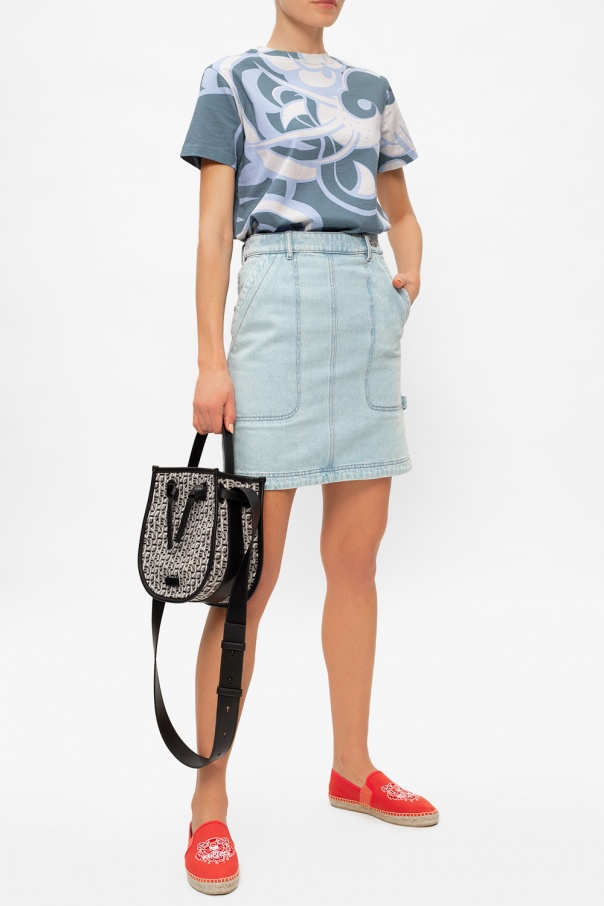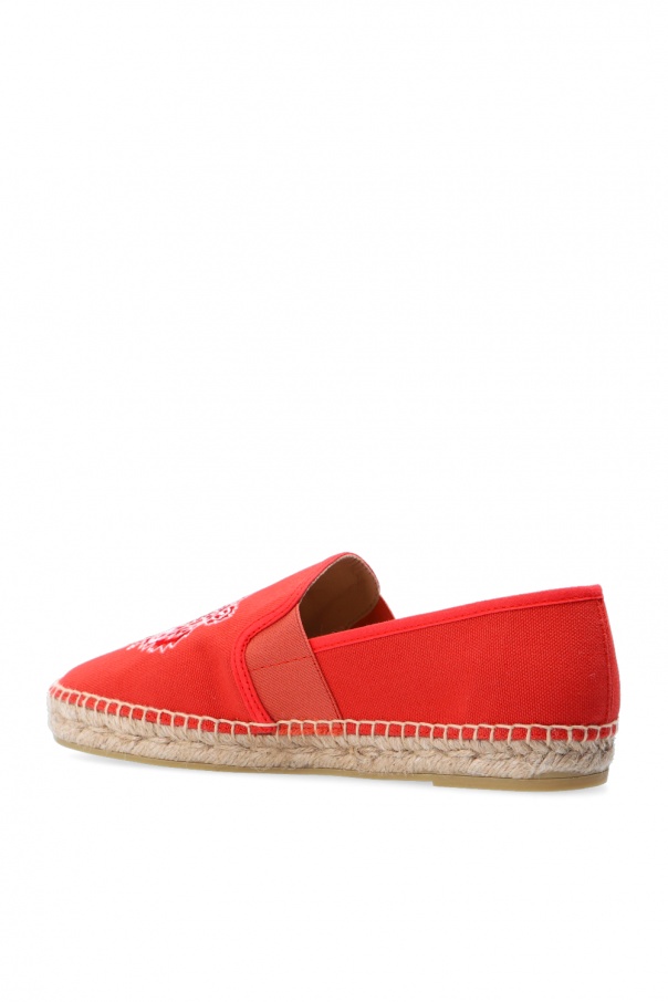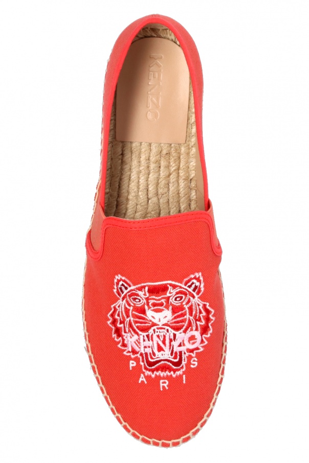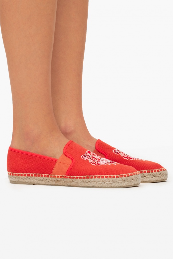Orange espadrilles from Kenzo. Embroidered with the signature tiger head motif, this pair is complete with elastic tape on the sides and a beige rubber sole.