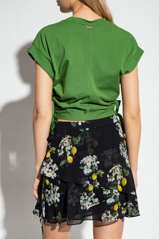 Green ‘Mira’ loose-fitting T-shirt from AllSaints. Made of organic cotton, this garment features a metal logo-engraved detail, decorative drawstrings on the sides, ribbed crew neck and loose-fitting short sleeves.