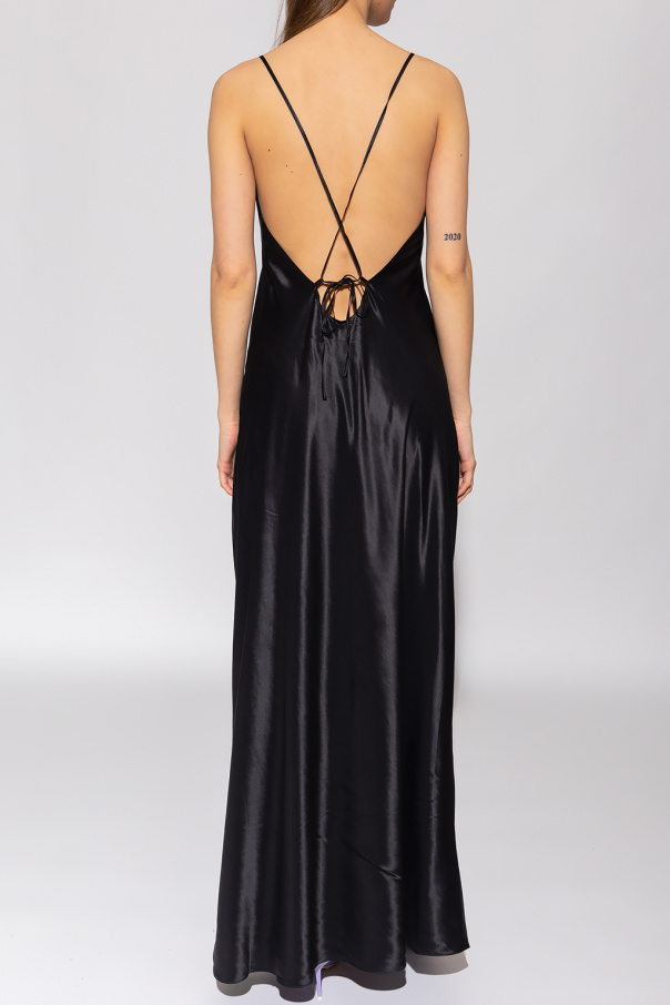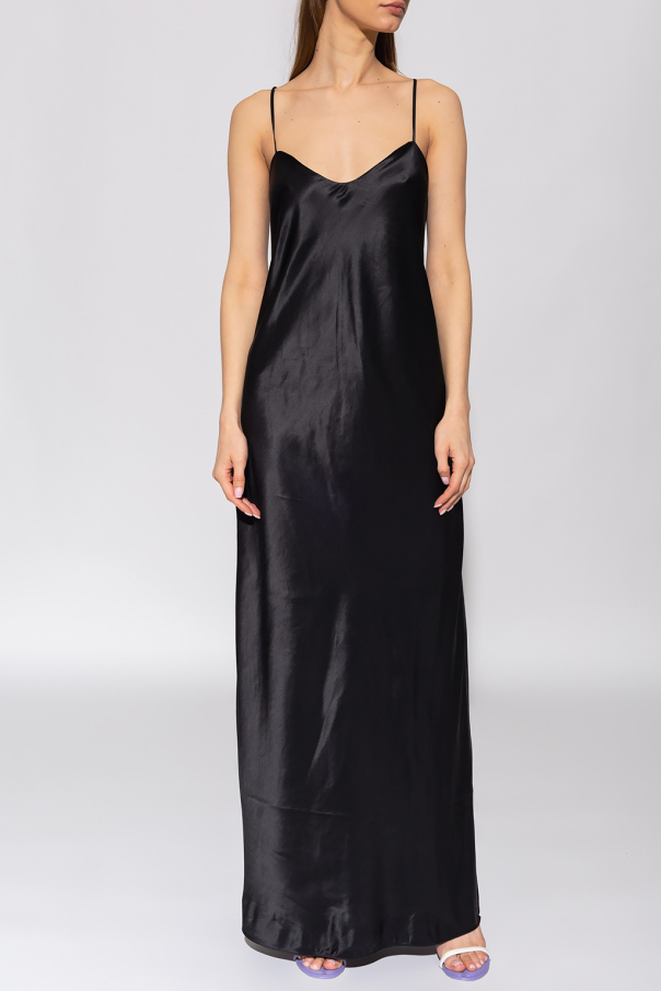 Black ‘Timo’ satin slip dress from Birgitte Herskind. Made of a blend of ECOVERO™ viscose and silk, this style is inspired by minimalist silhouettes from the 90s and features a denuded back with spaghetti straps at the back and a slightly flared hem.