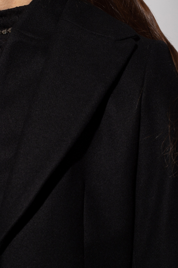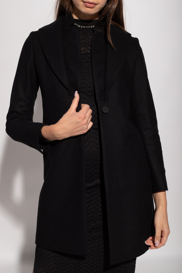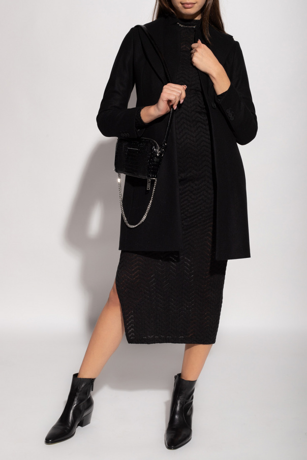 Black ‘Lyris’ coat from AllSaints. Crafted from wool, this garment features double lapels, a button fastening, two front pockets, a single rear vent and long sleeves with button cuffs.