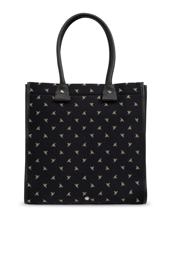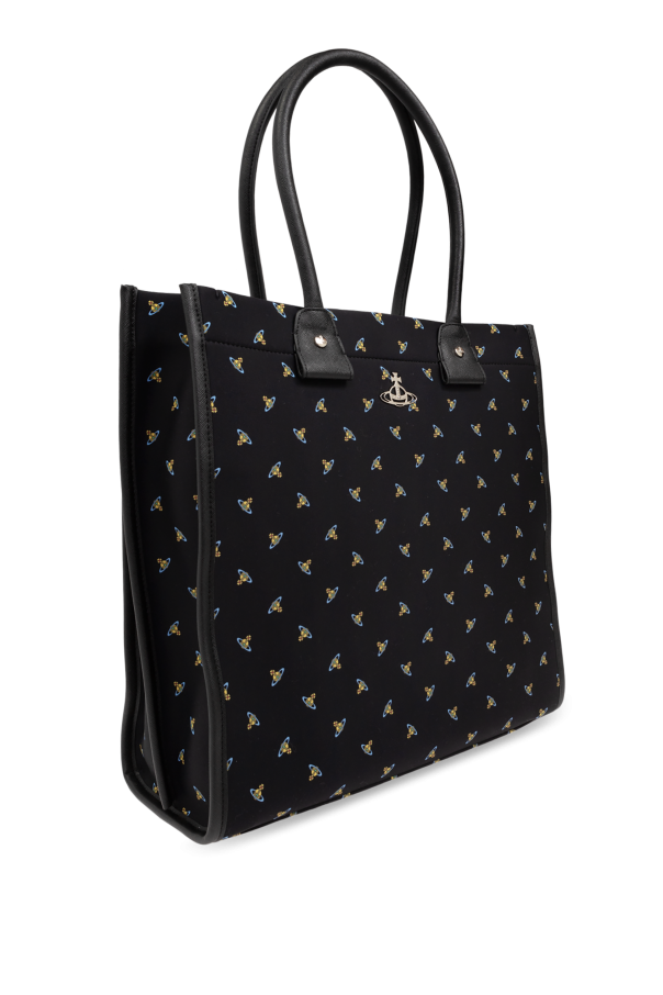 Introducing the Teddy Tote Bag from the exclusive collection by renowned designer Vivienne Westwood. Crafted predominantly in a luxurious black hue, this tote epitomizes elegance and functionality in one sophisticated package. Shape and Structure: The Teddy Tote boasts a rectangular shape with sturdy, reinforced sides. It features two long, rounded handles, allowing for versatile carrying options—either by hand or over the shoulder. Pattern: The bag\'s surface is adorned with a delicate, repeating motif of small, colorful elements that evoke a planetary or cosmic theme, adding a touch of whimsy to its sleek design. Material: The exterior is constructed from premium textile material, known for its durability and resistance to wear. The handles and edge reinforcements are crafted from sumptuous black leather, ensuring both style and longevity. Details and Logo: Centrally placed beneath the handles on the front is a striking, silver-toned metal logo of the designer, providing a refined contrast against the black backdrop. Interior: The interior is lined with a vibrant, patterned fabric, adding an element of surprise and uniqueness. Inside, you\'ll find an additional zippered pocket and a designer nameplate, ensuring practicality and style. Closure: The bag secures with a magnetic snap closure, offering easy access while keeping your belongings safe. Style: With its elegant yet contemporary design, the Teddy Tote is a unisex accessory suitable for daily use or special occasions. It is a luxurious statement piece that seamlessly blends style with convenience. Why Choose This Product? High-quality construction with premium materials. Elegant and versatile design suitable for any occasion. Unique planetary motif adds a touch of whimsy. Spacious interior with additional zippered pocket for organization. Secure magnetic snap closure for easy access. Renowned Vivienne Westwood branding for a touch of luxury.