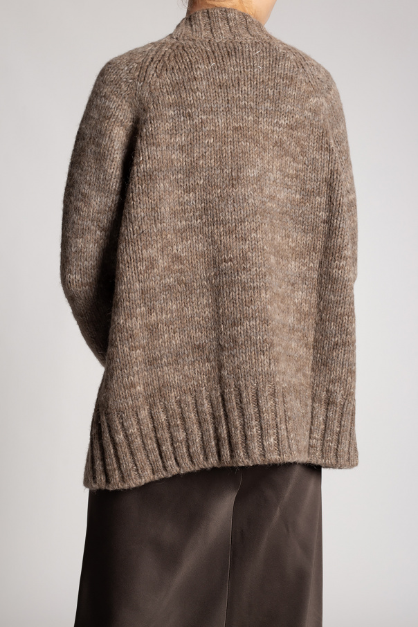 Grey and brown cardigan from Maison Margiela. Crafted from a wool blend in a rib-knit design, this style features a V-shaped neckline, long sleeves and an embroidered logo on the back.