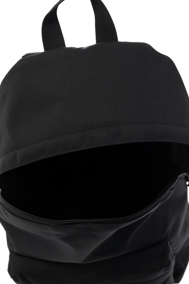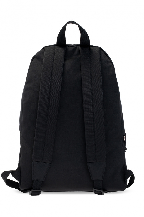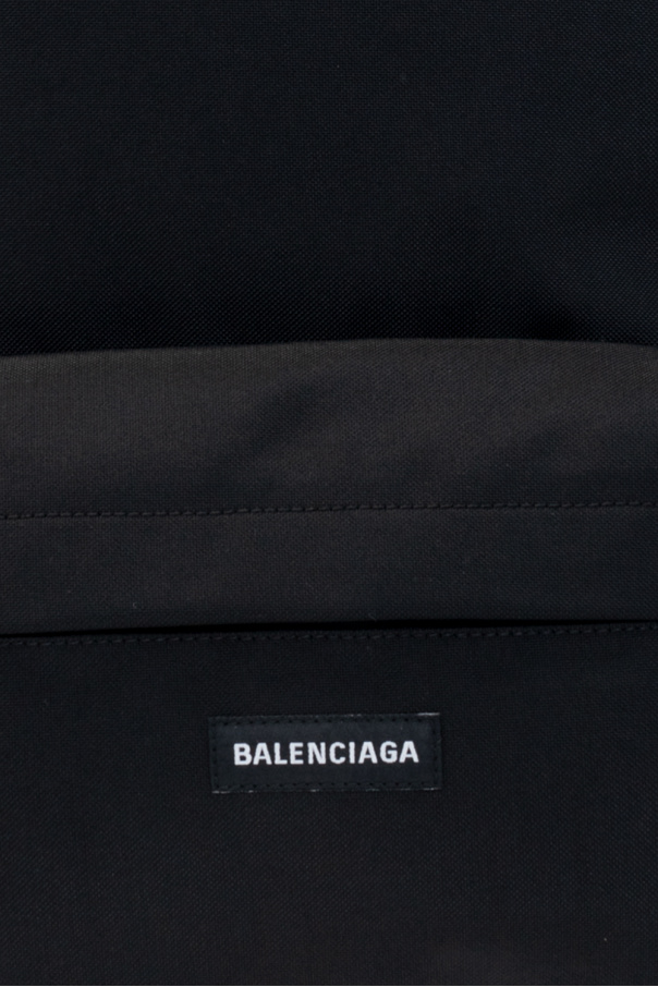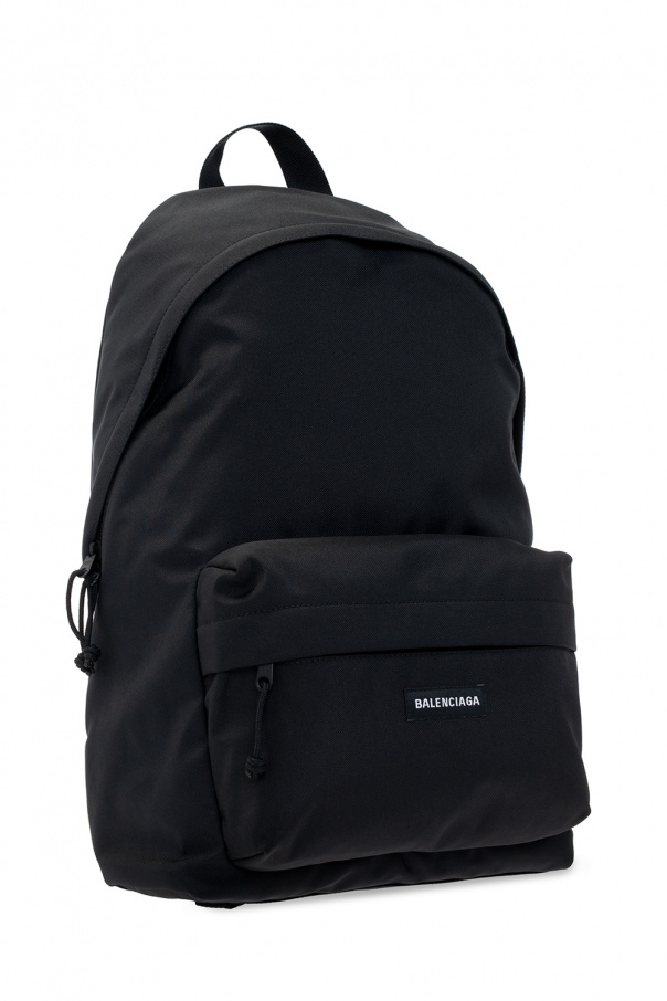 Black ‘Explorer’ backpack from Balenciaga. Emblazoned with a black and white logo patch, this design features a two-way zipper, a zip-up pocket on the front, a half-round top handle, adjustable shoulder straps, black metal hardware and one internal compartment with one slip pocket and one zipped pocket.