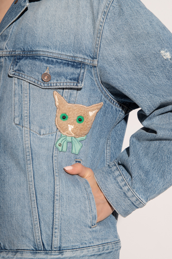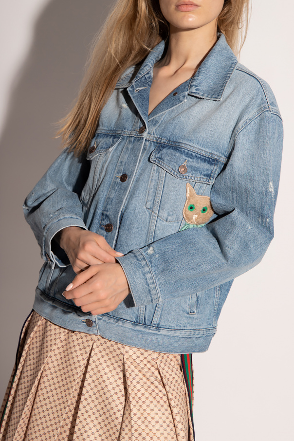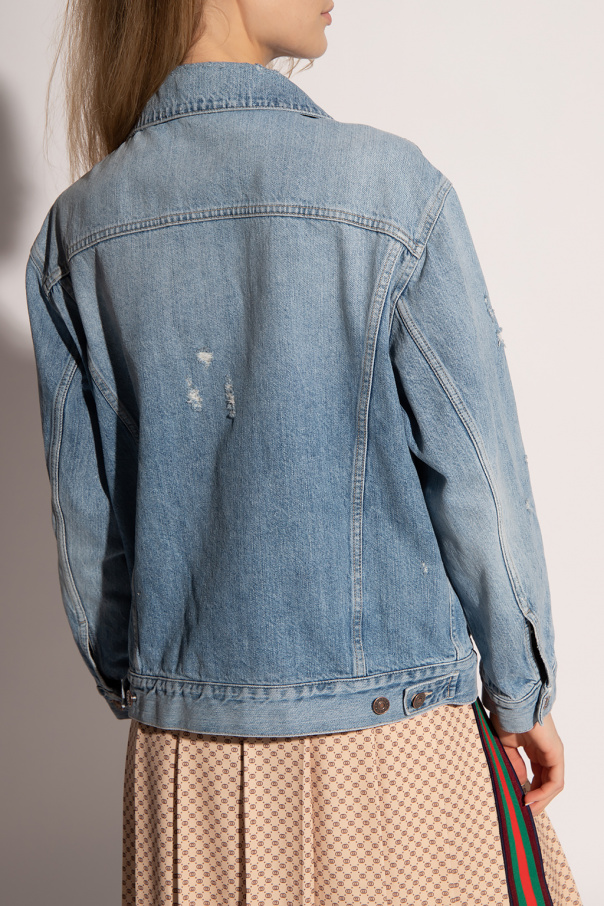 Blue distressed denim jacket from Gucci. Fastened with buttons, this garment features a decorative logo appliqué, two buttoned flap pockets and long sleeves.