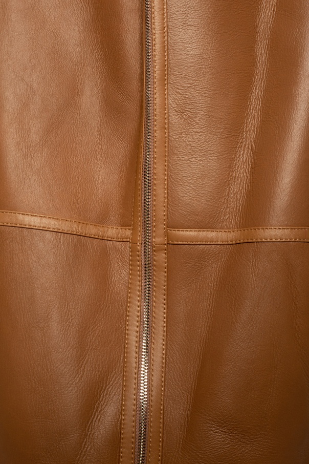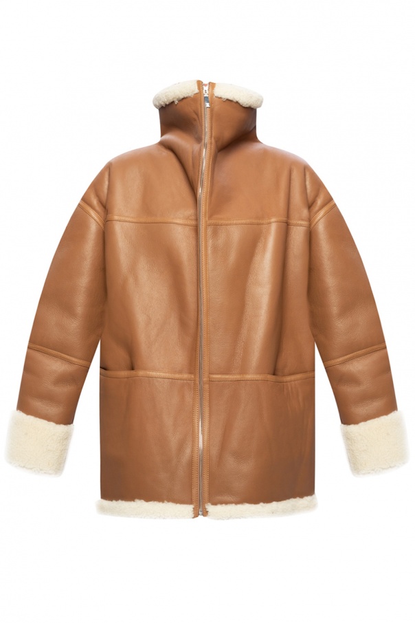 Brown and white shearling jacket from Toteme. Crafted from lambskin, this oversized silhouette employs zip fastening, standing collar and two frontal pockets.