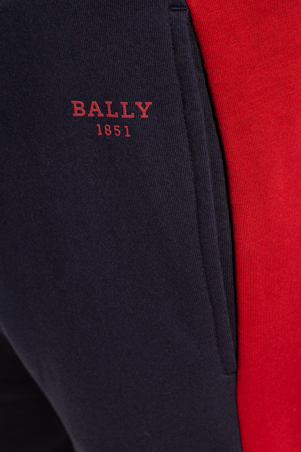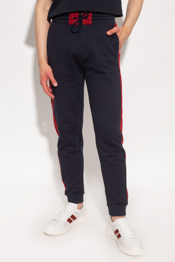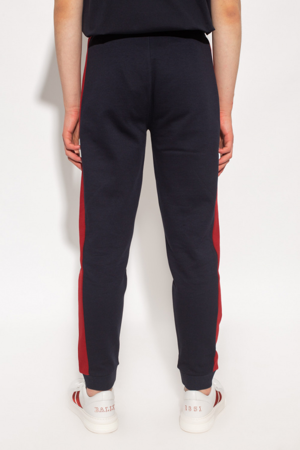 Navy and red sweatpants from Bally. Crafted from cotton, this pair features an elastic waistband with drawstrings, logo detail, two slip pockets and ribbed cuffs.