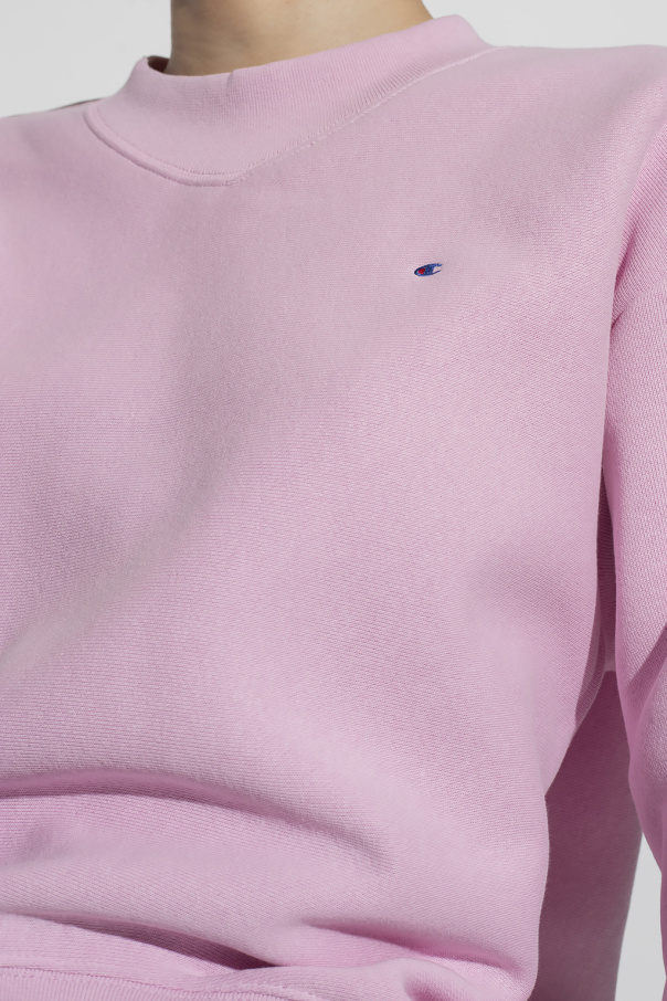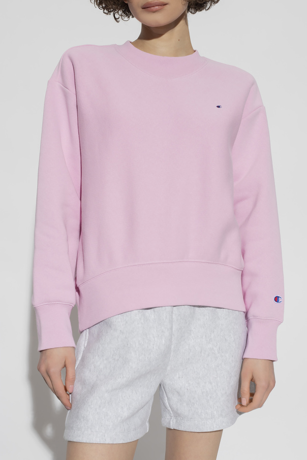 Pink crewneck sweatshirt from Champion. Crafted from a cotton blend, this long sleeve design features logo details and ribbed trims at the neck, hem and cuffs.