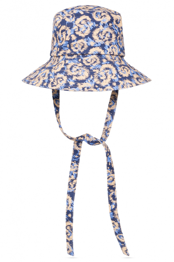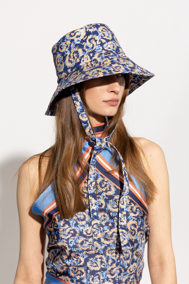 Navy blue, blue and beige bucket hat from Salvatore Ferragamo. Made of cotton, this item showcases the brand's signature Gancio S pattern and a drawstring fastening.