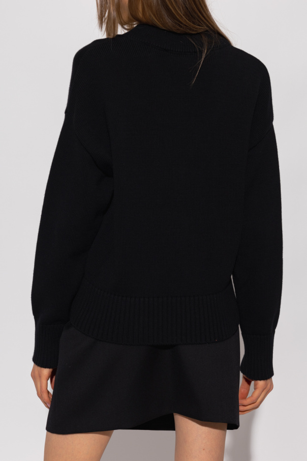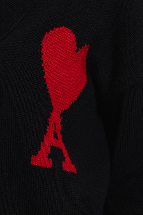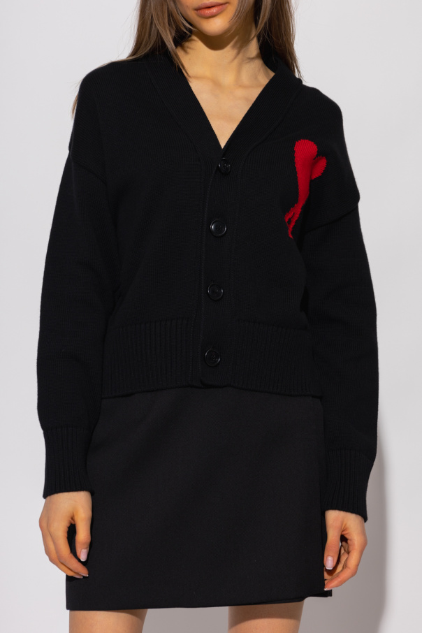 Black cardigan from Ami Alexandre Mattiussi. Made of an organic cotton and wool blend, this long sleeve design features black buttons, red ‘Ami de Coeur’ embroidery and ribbed trims at the hem and cuffs.