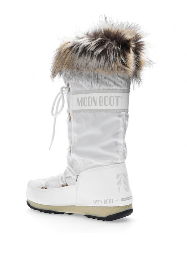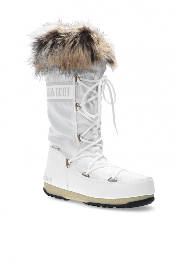 White ‘Monaco WP 2’ snow boots from Moon Boot. Bounded with synthetic fur, this lace-up pair sits on a black rubber sole and showcases the brand's logo rendered in grey print.