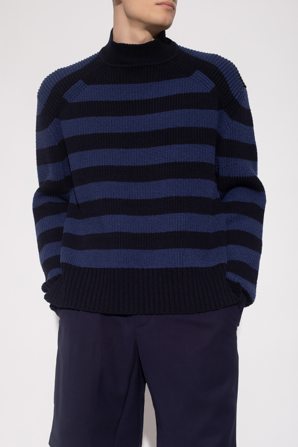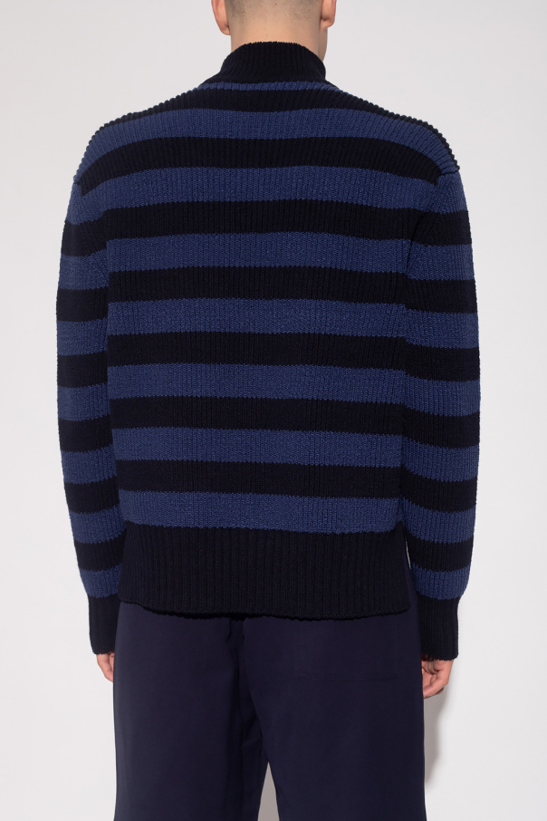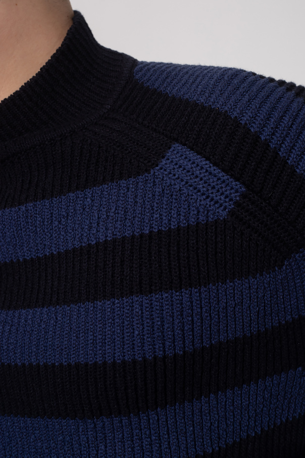 Black and navy knit sweater from Jacquemus. This long sleeve design is enriched by a stripe pattern and side slits.