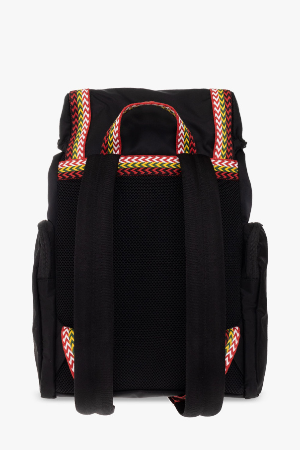 Black backpack from Lanvin. Crafted from technical material with a glossy finish, this design secures with colourful, adjustable buckle straps and showcases the brand\'s logo on the flap. It is complete with a top handle, zip pockets on the front and sides, silver-tone metal hardware and a drawstring interior with a slip pocket.