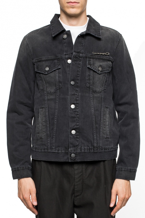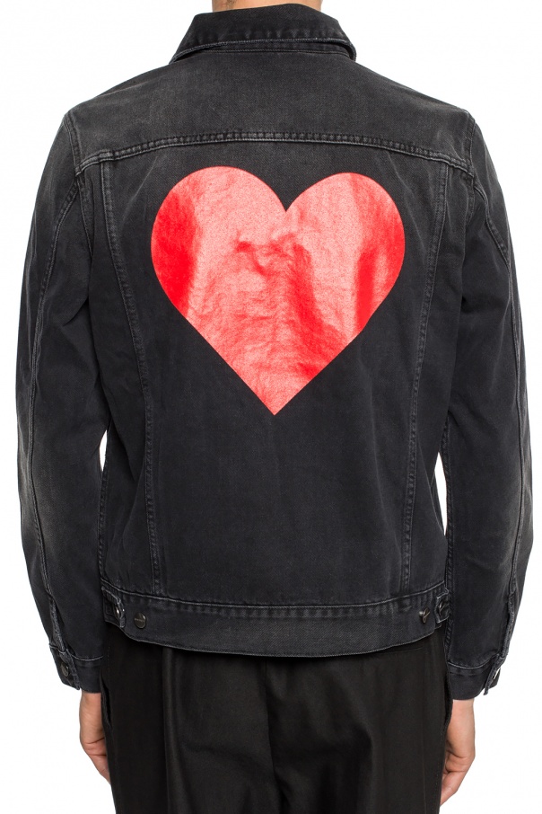 Black distressed denim jacket from Palm Angels. Fastened with logo-embossed buttons in silver-tone. Two flap pockets fastened with buttons and a safety pin featuring a logo on the front. Red heart print at the back.