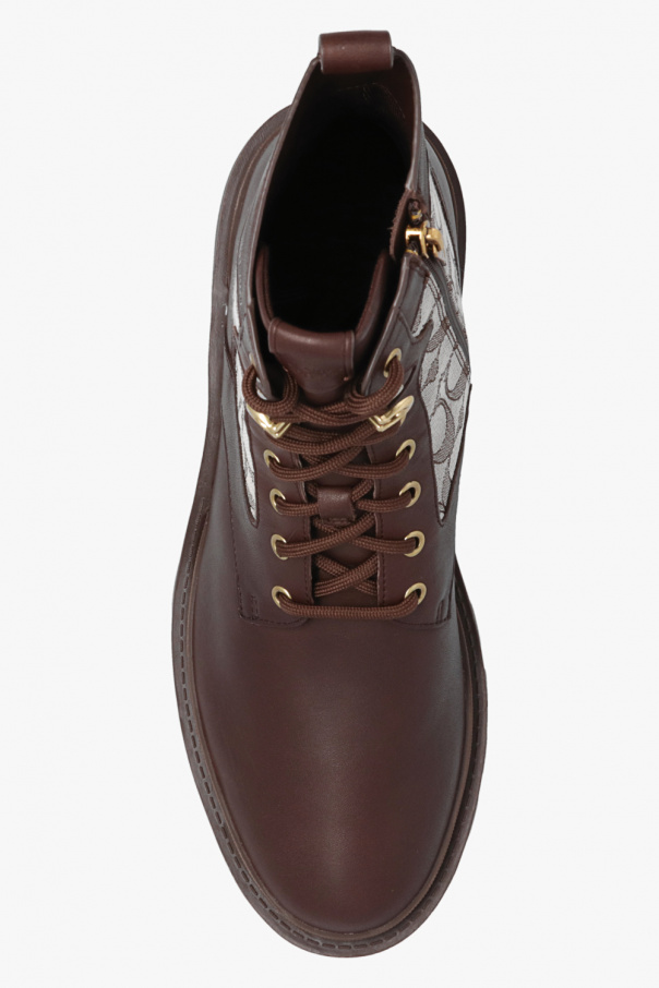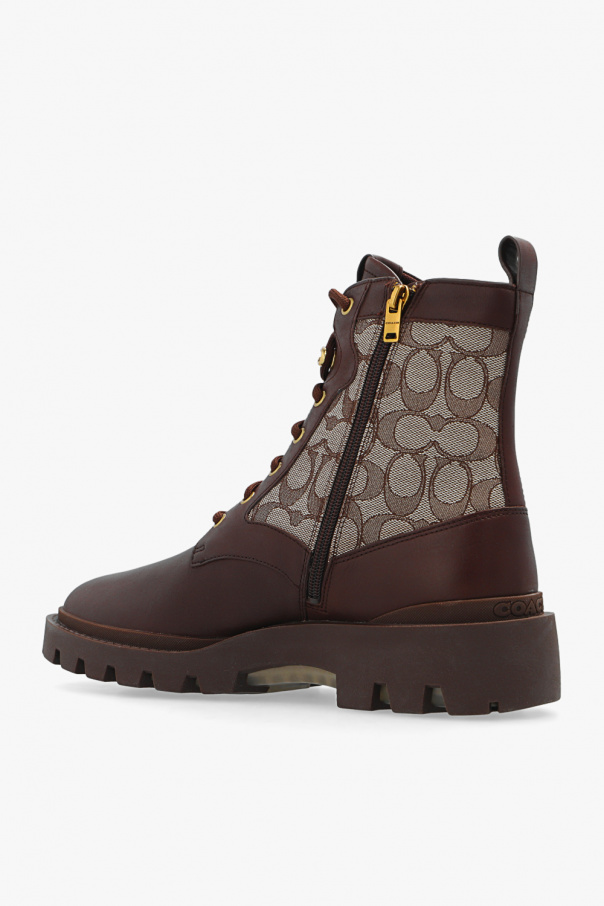 Brown and cream ‘Citysole’ ankle boots from Coach. Crafted from leather, this lace-up model features monogrammed canvas detailing, a side zip fastening, a logo-embossed tongue patch and a brown rubber sole with a transparent trim.