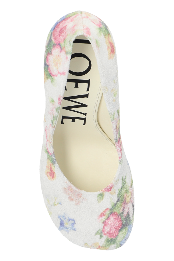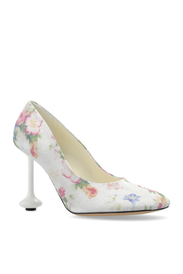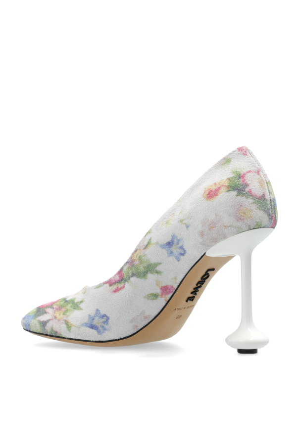 Introducing the exquisite Toy High-Heel Pumps from the renowned fashion house Loewe. These elegant heels are a paragon of sophistication, seamlessly blending classic design with contemporary flair. The design boasts a timeless silhouette with a rounded toe and a high stiletto heel. The creamy exterior is adorned with a delicate floral pattern, featuring a romantic medley of pink, blue, and green hues that exude elegance and charm. Crafted from premium materials, the outer layer is covered in luxurious suede with a floral print. The interior is lined with soft, calfskin leather, ensuring maximum comfort. The standout feature is the distinctive white heel, ingeniously shaped like an inverted goblet or mushroom, adding a unique touch to the design. Inside, the pump showcases a prominent black designer logo on the insole, a testament to its exclusive origin. The beige leather sole further enhances the shoe’s luxurious appeal. Why Choose This Product? Timeless and romantic floral design Unique and eye-catching heel shape High-quality materials for durability and comfort Exclusive and recognizable designer branding Perfect for special occasions and adding a touch of elegance to any outfit