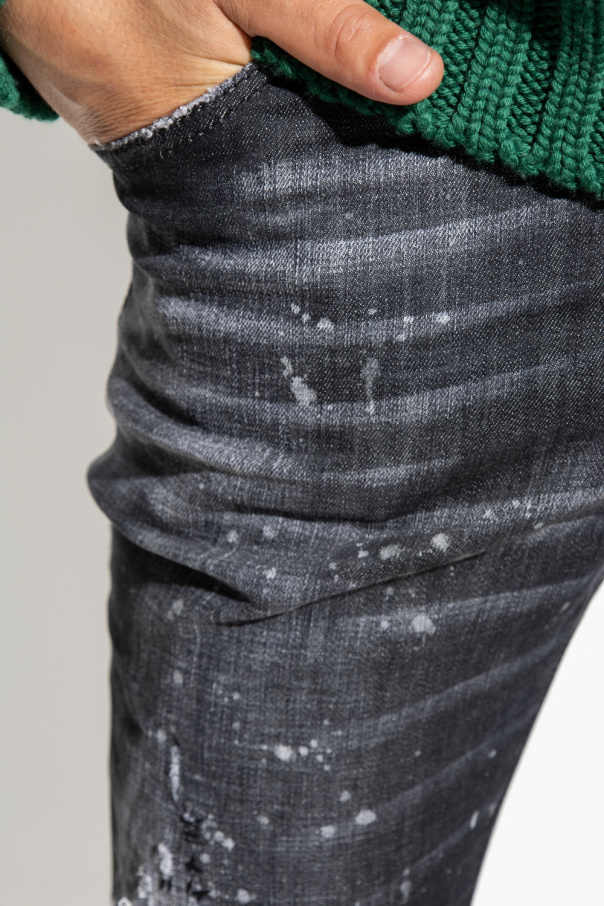 Black and grey ‘Skater’ jeans from Dsquared2. Made of cotton, this tapered leg pair features a zip and button closure, worn effect, paint splatter print, black logo-embossed patch at the back and five slip pockets.