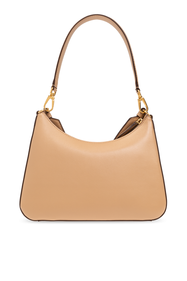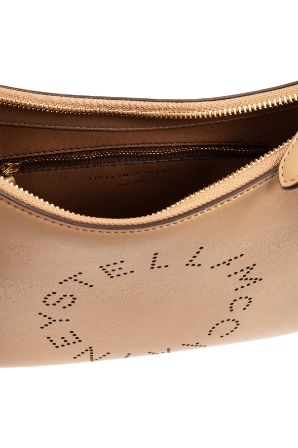 Beige shoulder bag from Stella McCartney. Made of vegan leather, this model features a zip fastening, perforated logo, detachable half-round handle, adjustable shoulder strap with a logo in black, gold-tone metal hardware and one internal compartment with one zip pocket.
