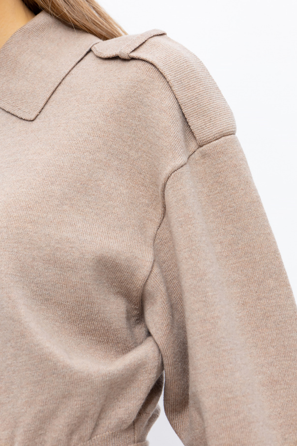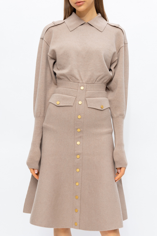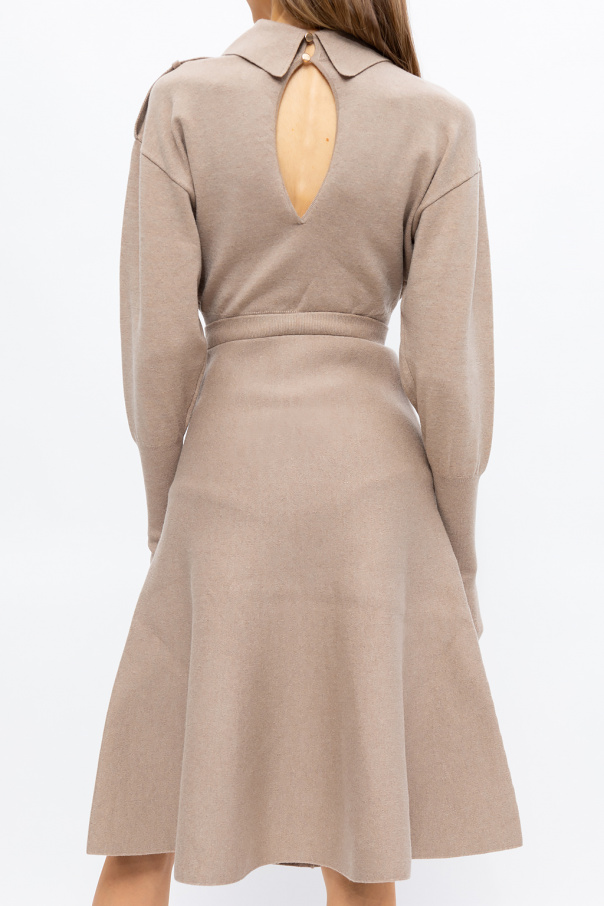Beige bodysuit from Victoria Beckham. Made with a ribbed texture, this style features a distinctive collar, button fastenings, long sleeves and a snap closure at the bottom.