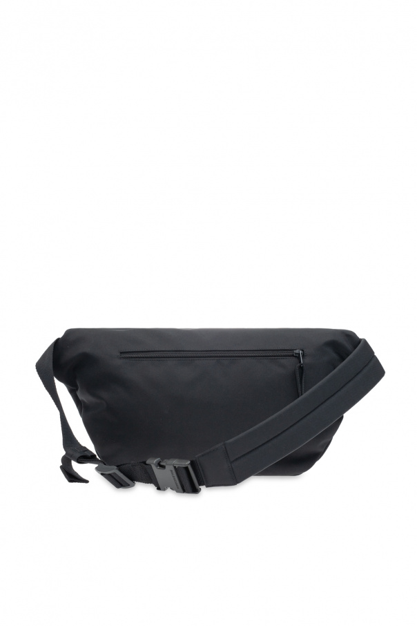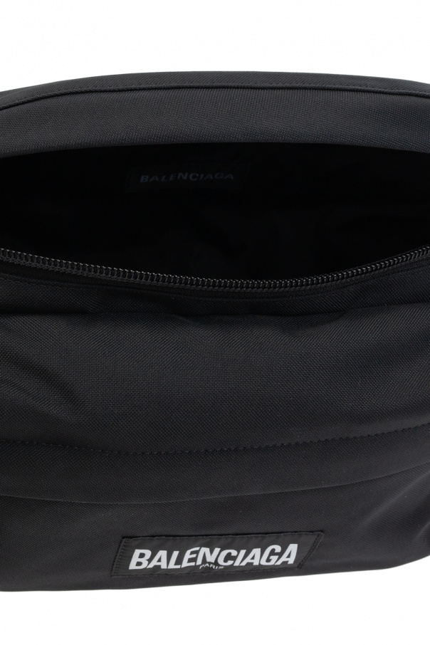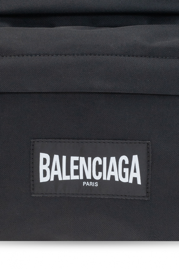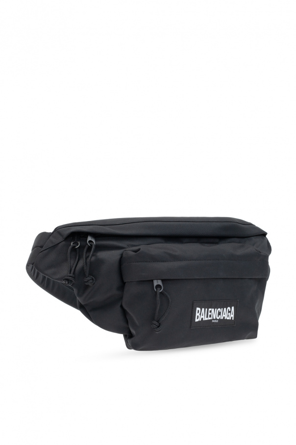 Black belt bag from Balenciaga. Emblazoned with an embroidered white logo appliqué, this design fastens via a two-way zip and features a zip pocket on the front and at the back, an adjustable waist belt, one internal compartment and a shoulder strap which allows it to be worn on the back.